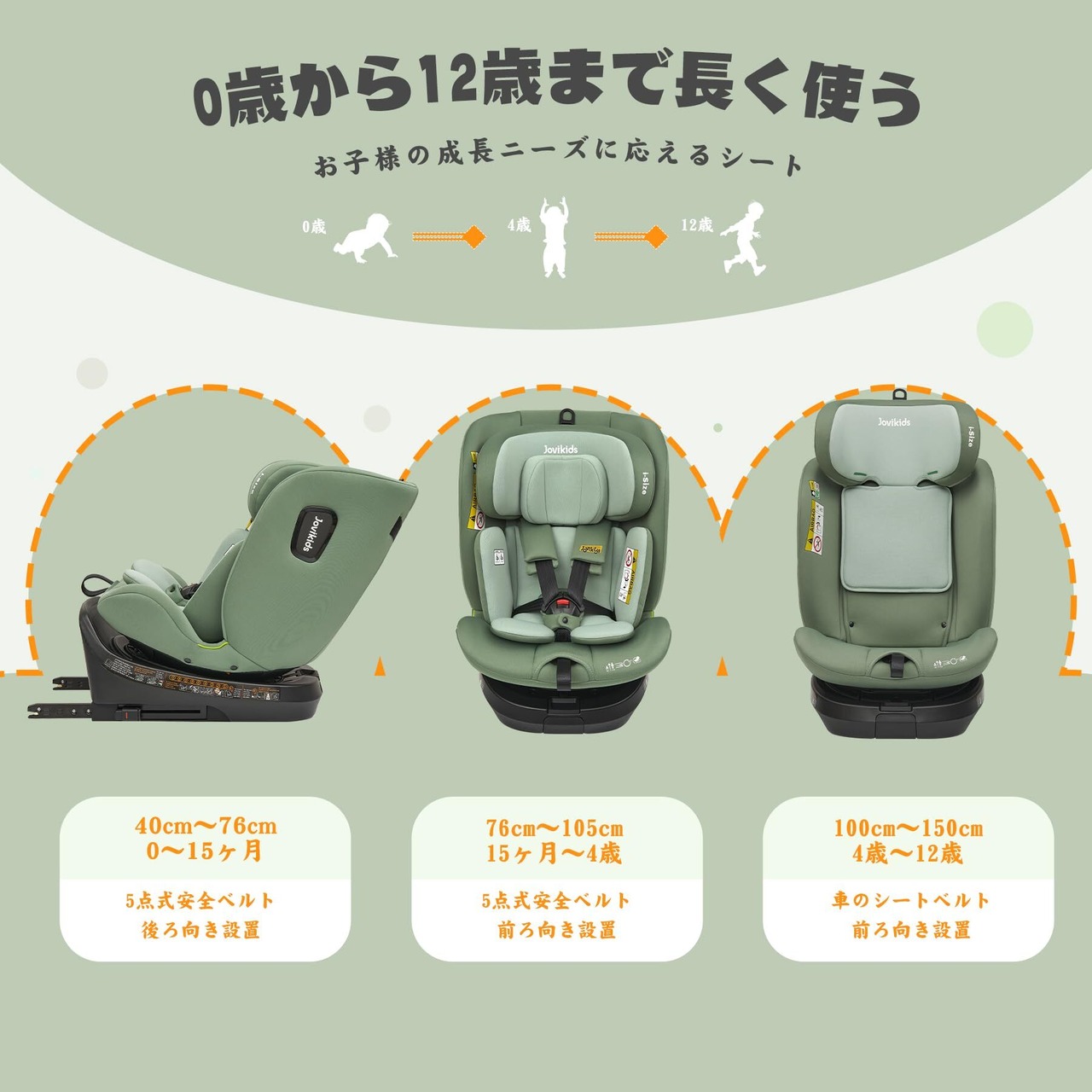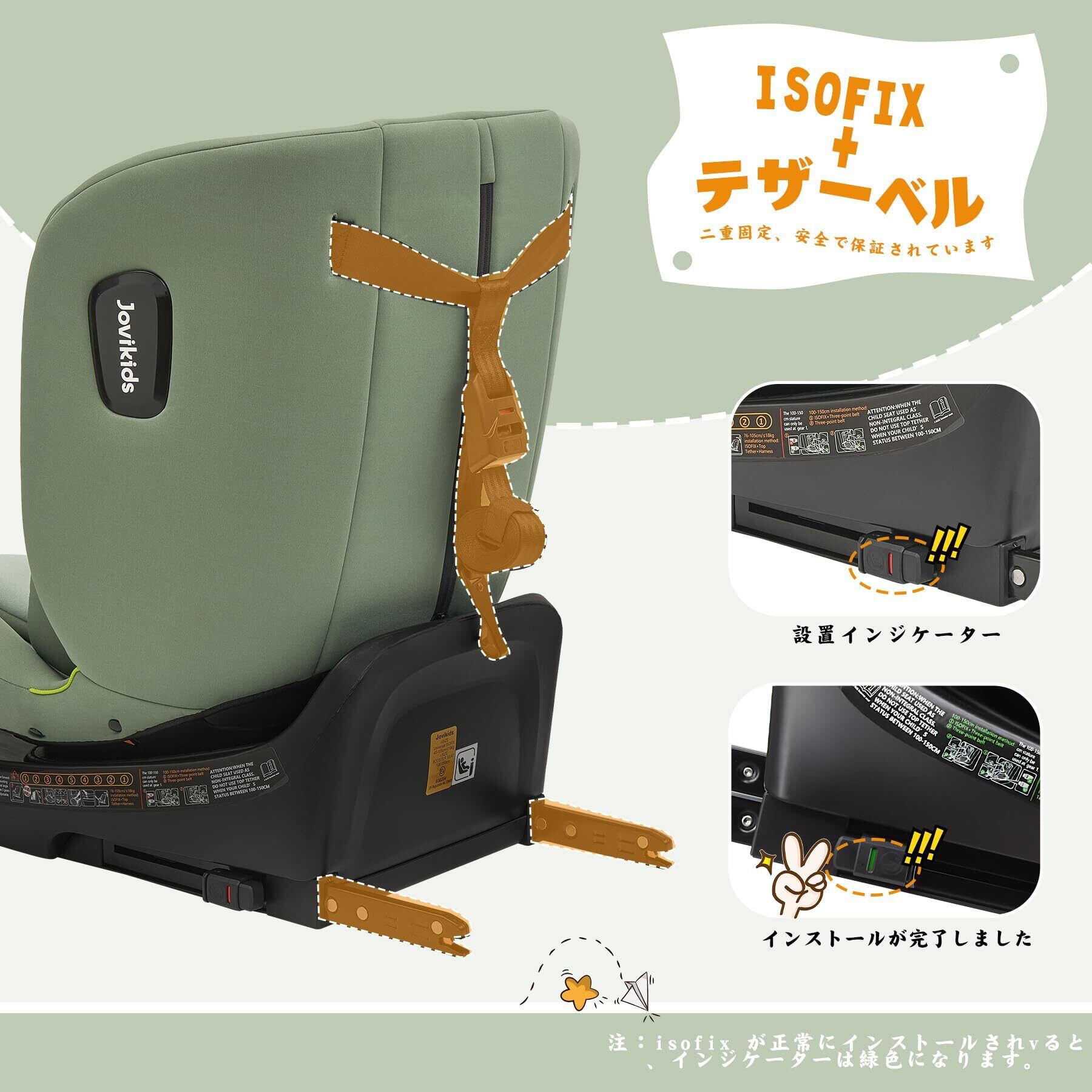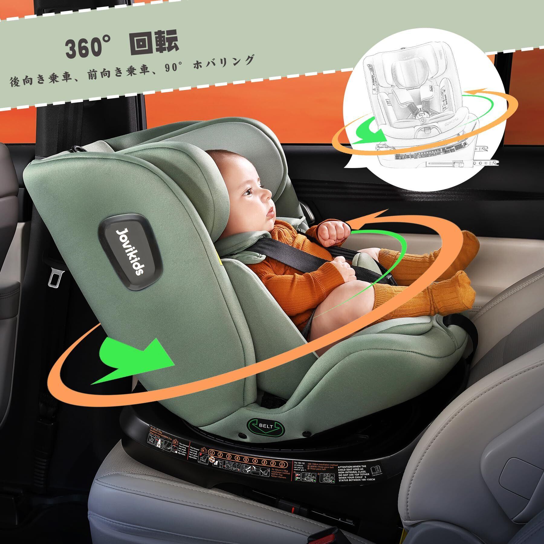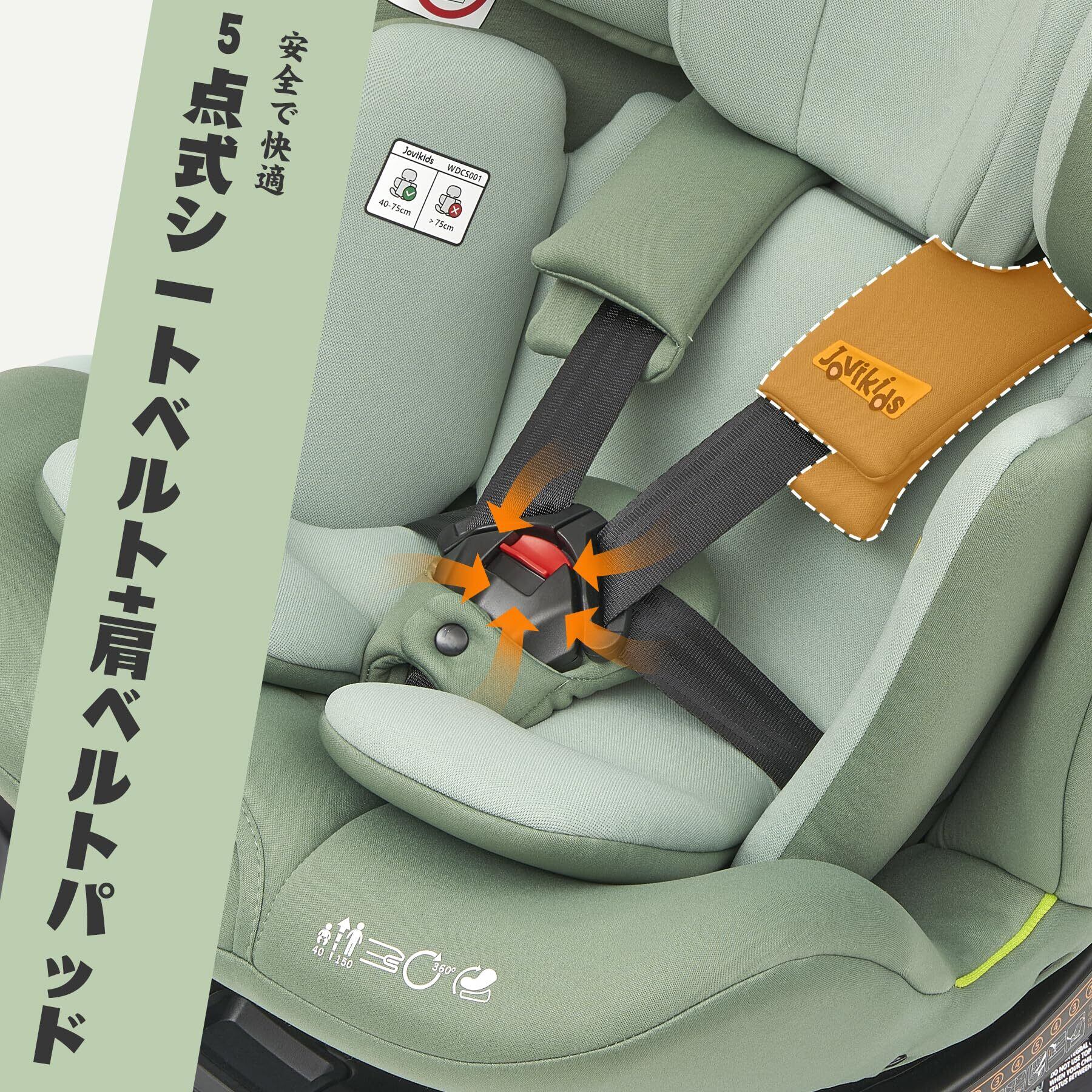【特価セール】Jovikids チャイルドシート ISOFIX、 0か月~12歳頃 360°回転式 i-Size R129適合 新生児ベビーシート、ロングユースコンパクト、調整可能なライ角 (グリーン)