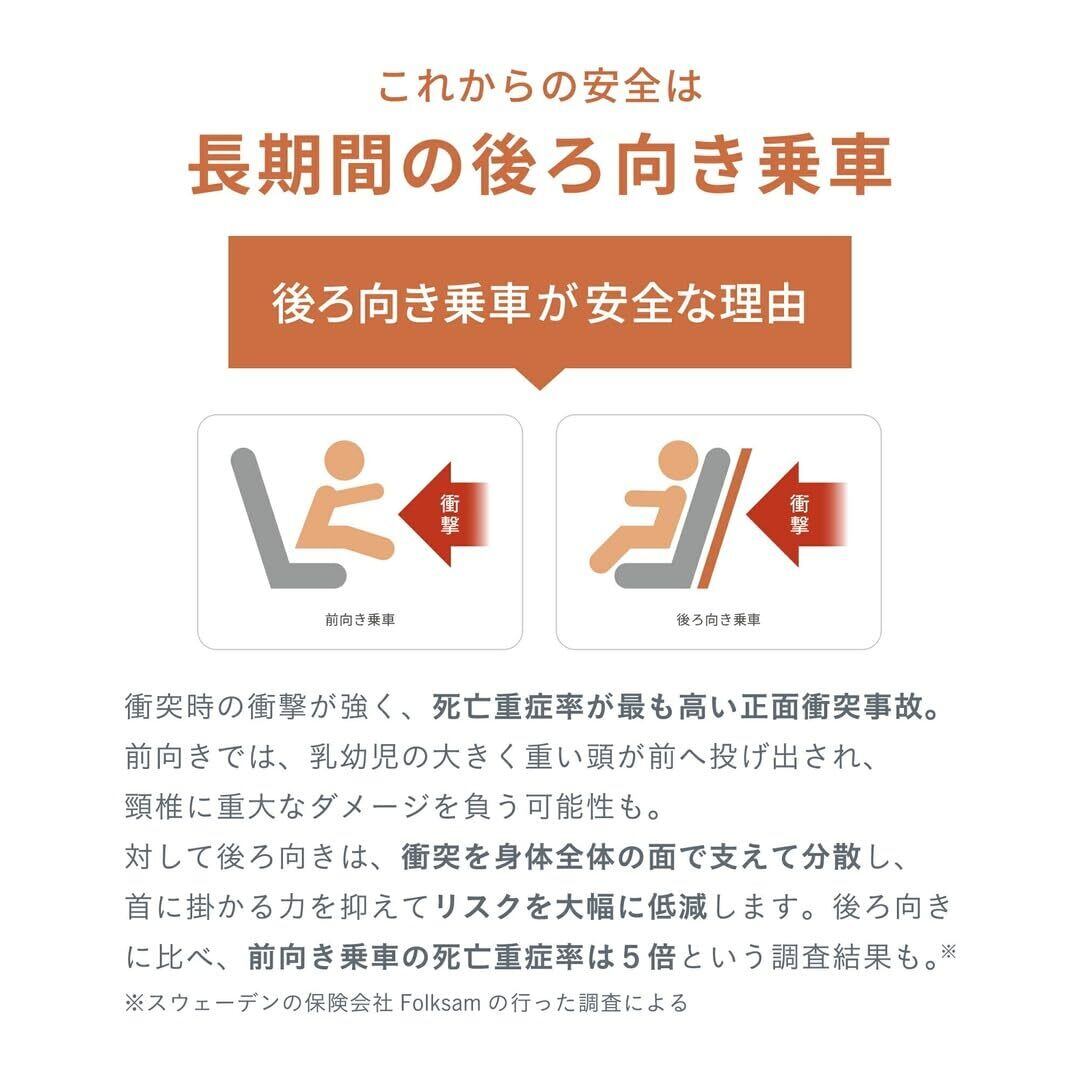 "衝突時のエネルギーが強く、死亡重症率が最も高い正面衝突事故。 前向きでは、乳幼児の大きく重たい頭が強い力で前方へ投げ出され、 頸椎に重大なダメージを負ってしまう可能性があります。 後ろ向きに乗せる事で衝突に対し身体全体を面で支え、衝撃を分散し、 首に掛かる力を抑え、重傷受傷リスクを大幅に低減します。 DUALFIX PROは最長で4歳頃、身長105㎝体重19㎏まで後ろ向き乗車が可能です。 システムの都合上、体重を1kgと入力しておりますが、お子様の身長に合わせてお選び下さい。