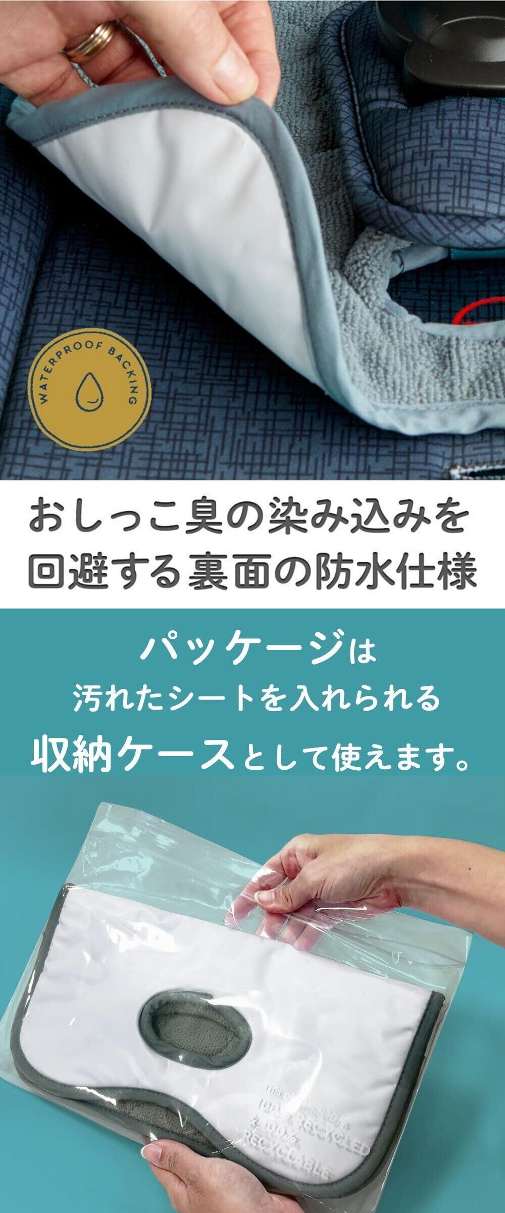 ●裏面は防水性の高いPEVA(ポリエチレン酢酸ビニール)を使用しており水分の浸透を防ぎます。 また、柔らかで優しい肌触りの表面が水分を吸収してくれます。