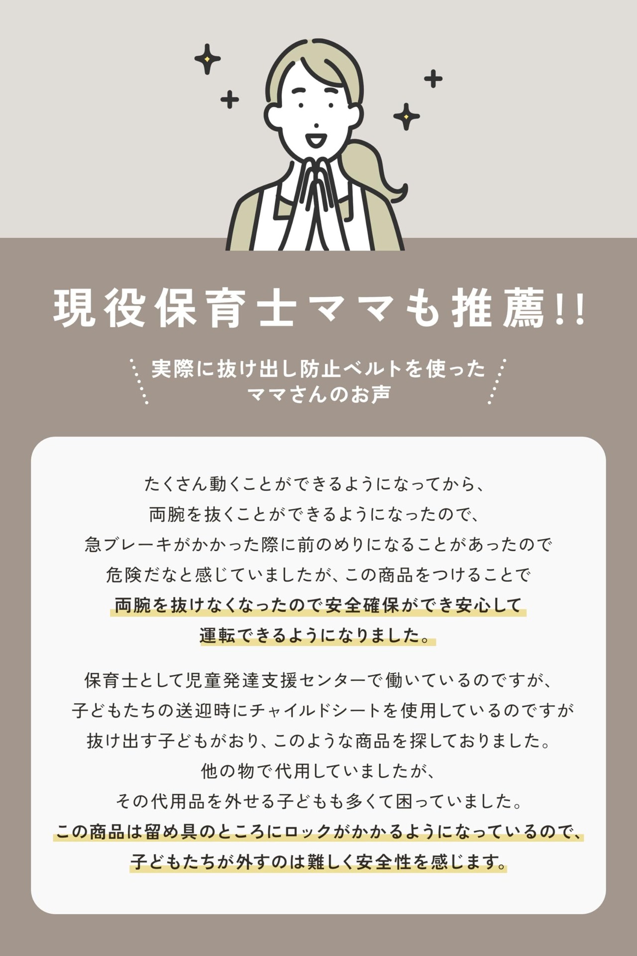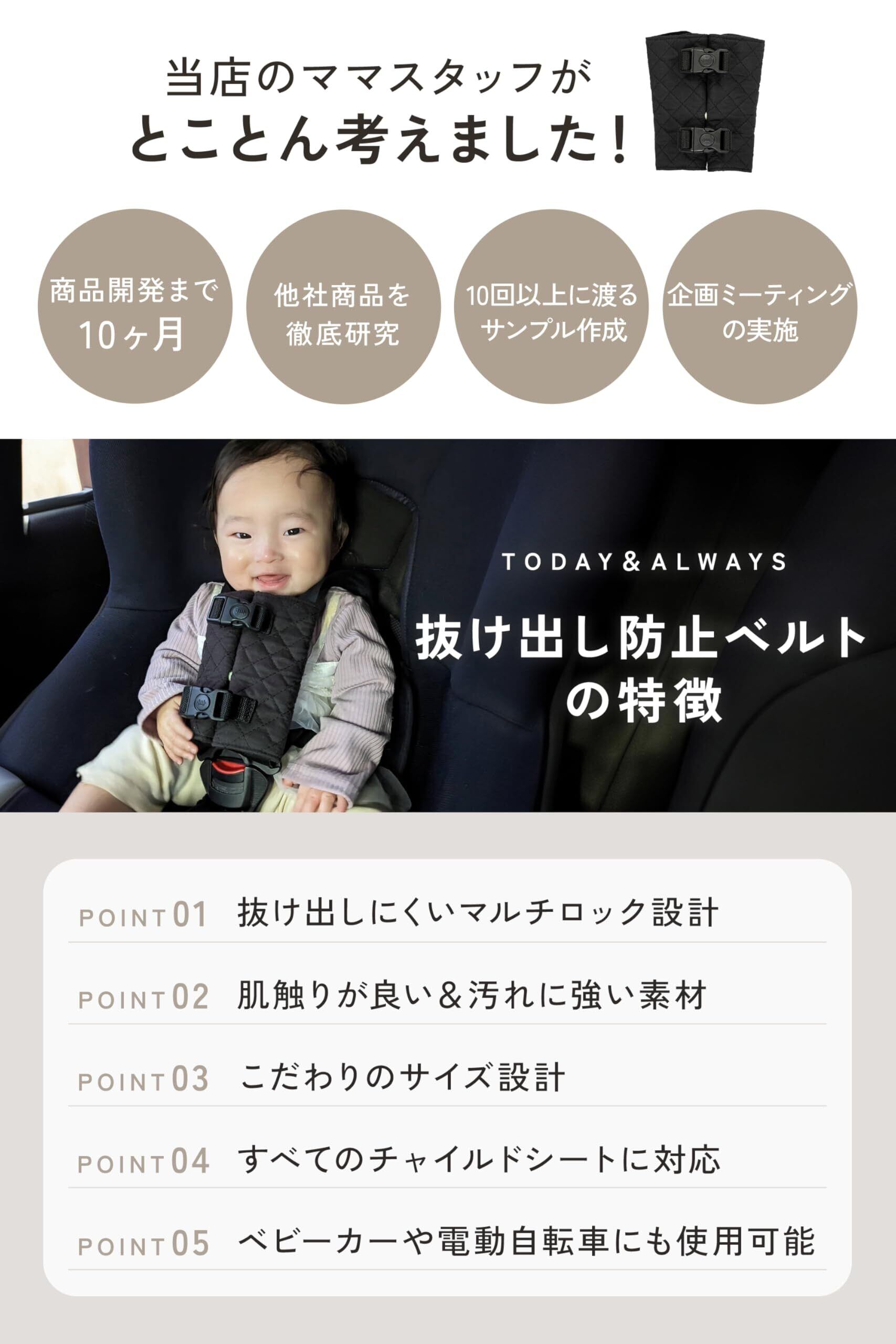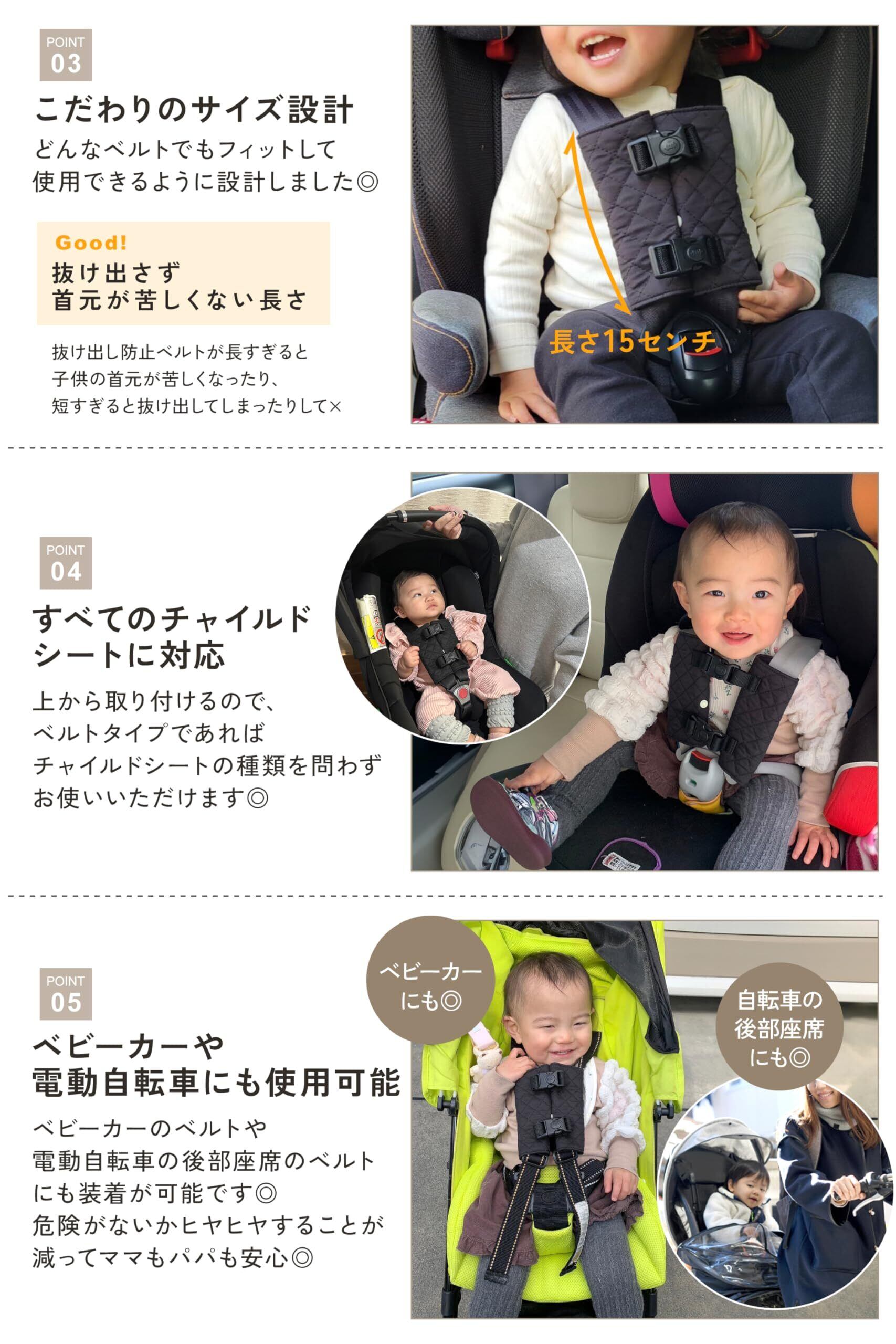 【Point03 こだわりのサイズ設計】 どんなベルトでもフィットして使用できるように設計しました◎ 長さ15センチがこだわりポイント Good! 抜け出さず首元が苦しくない長さ 抜け出し防止ベルトが長すぎると子供の首元が苦しくなったり、 短すぎると抜け出してしまったりして×