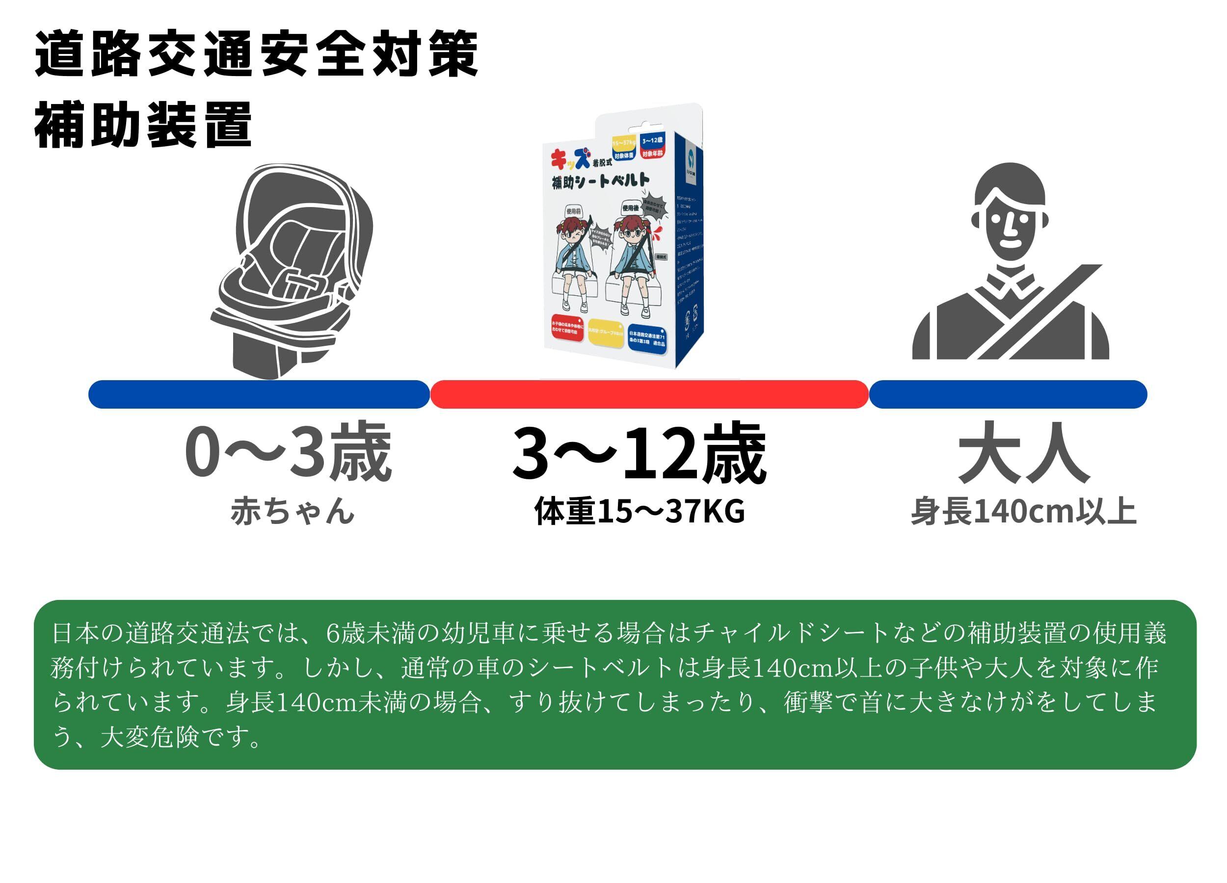 【適用年齢と使用シーン】適用年齢3~12歳、対象体重15~37KG。タクシー・レンタカー・実家や友人の車など、チャイルドシート・ジュニアシートがない場面でも、小さく軽量で持ち運びも楽々な本製品があれば、どんなシーンにも対応できます。