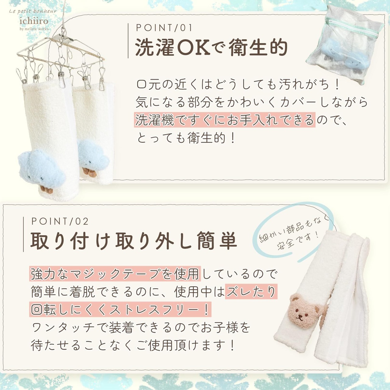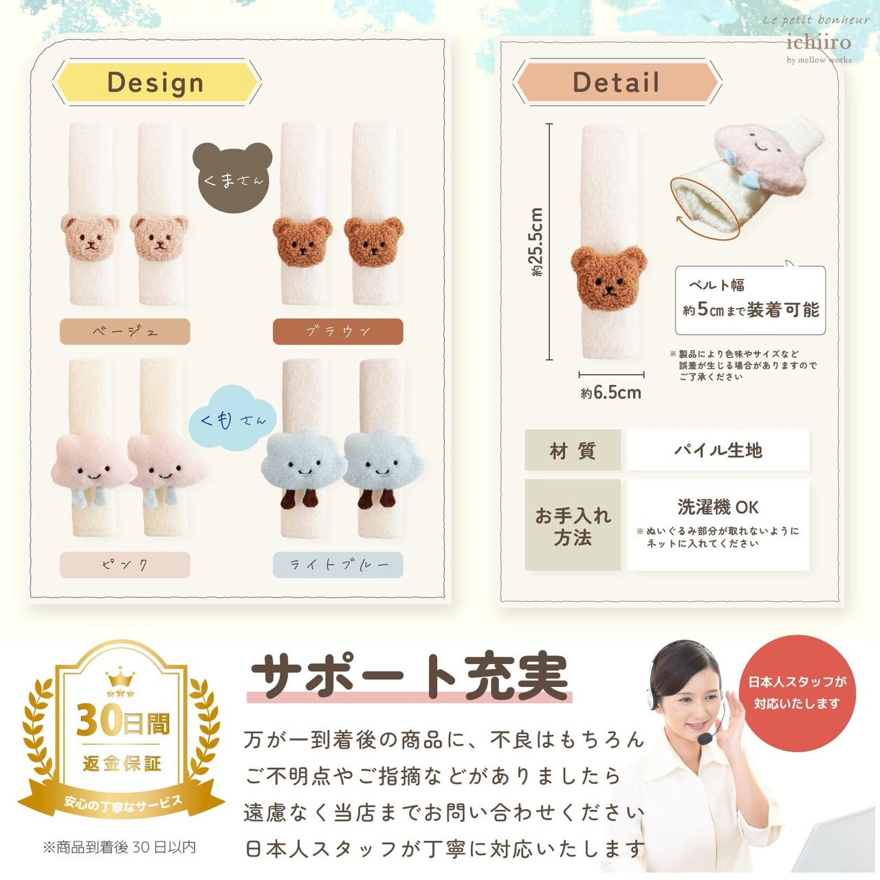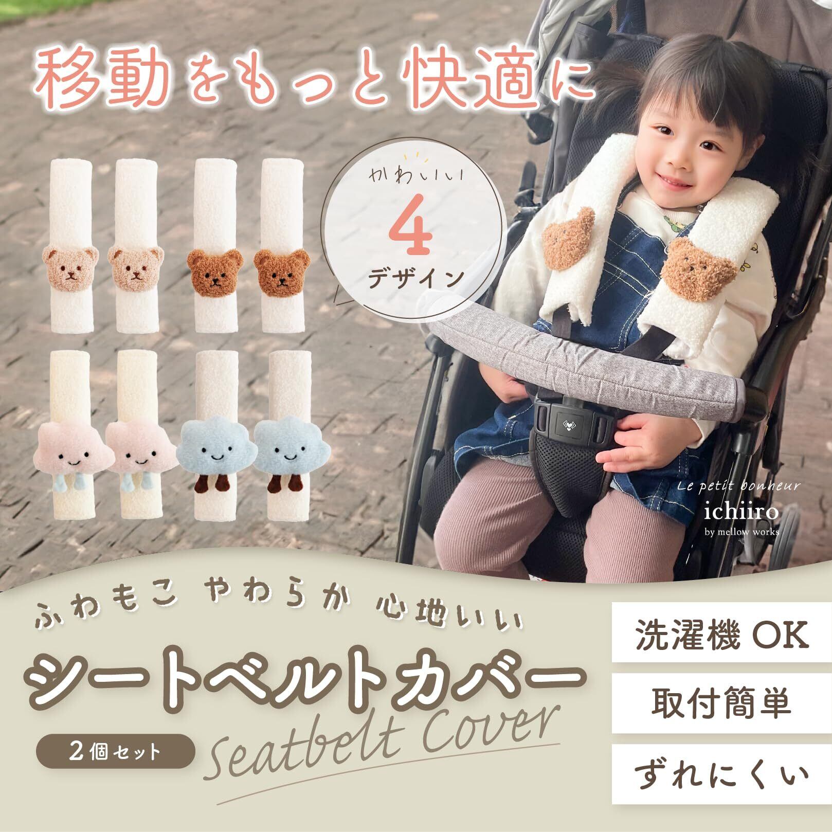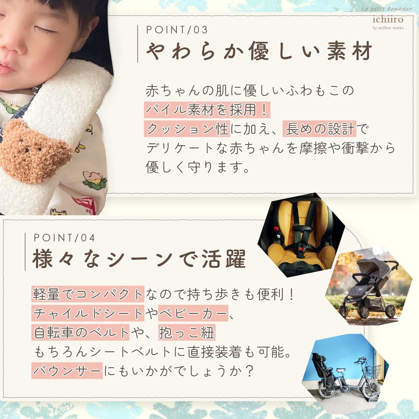 様々なシーンで活用できます。車のシートベルト、チャイルドシートベルト、ベビーカーのベルトカバーなど。プレゼントにもおすすめです。
