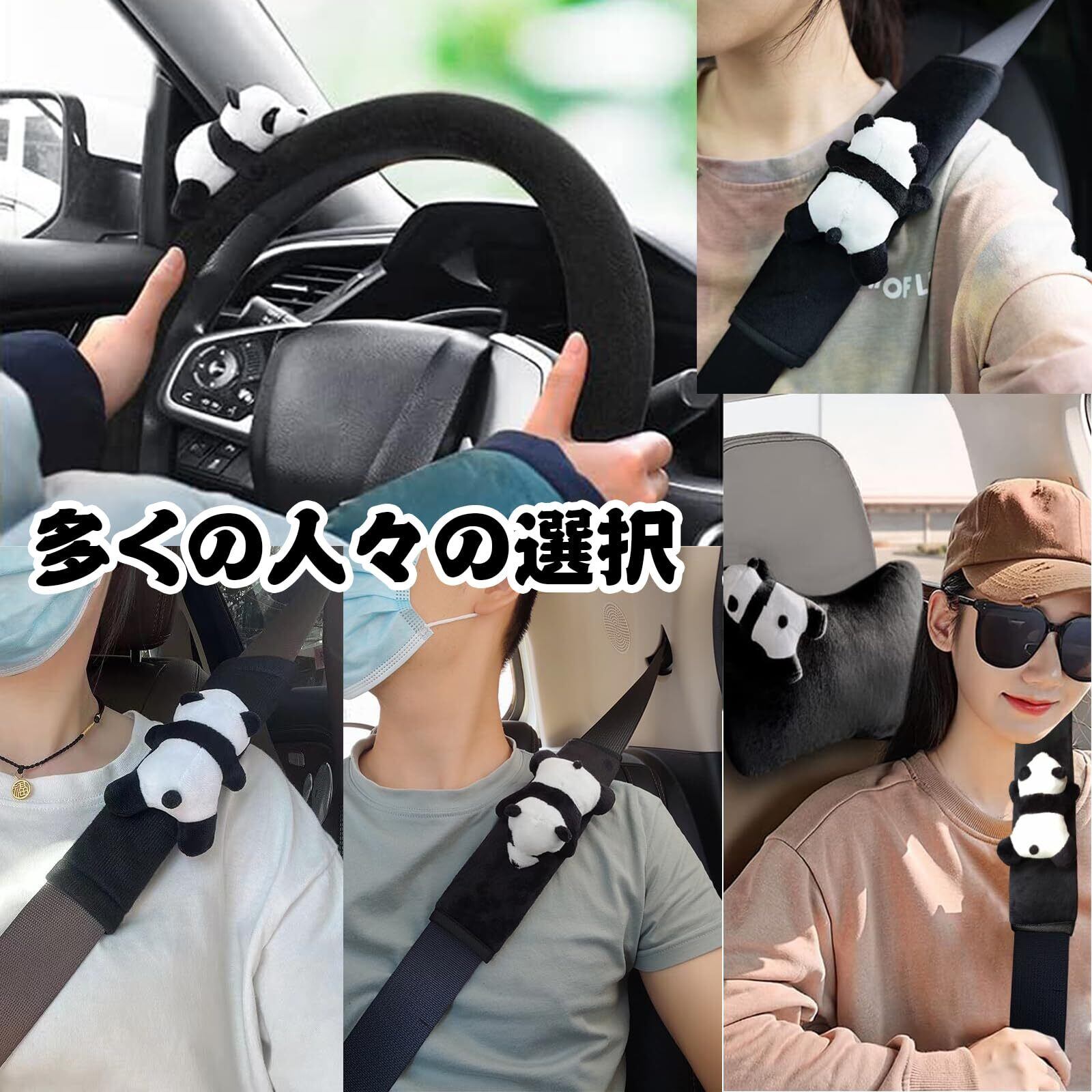 シートベルトカバー ネックピロー かわいい ハンドルカバー かわいいパンダ ぬいぐるみ シートベルトパッド 肩当てパッド 肩保護 旅行 運転 車用品 アクセサリー5セット