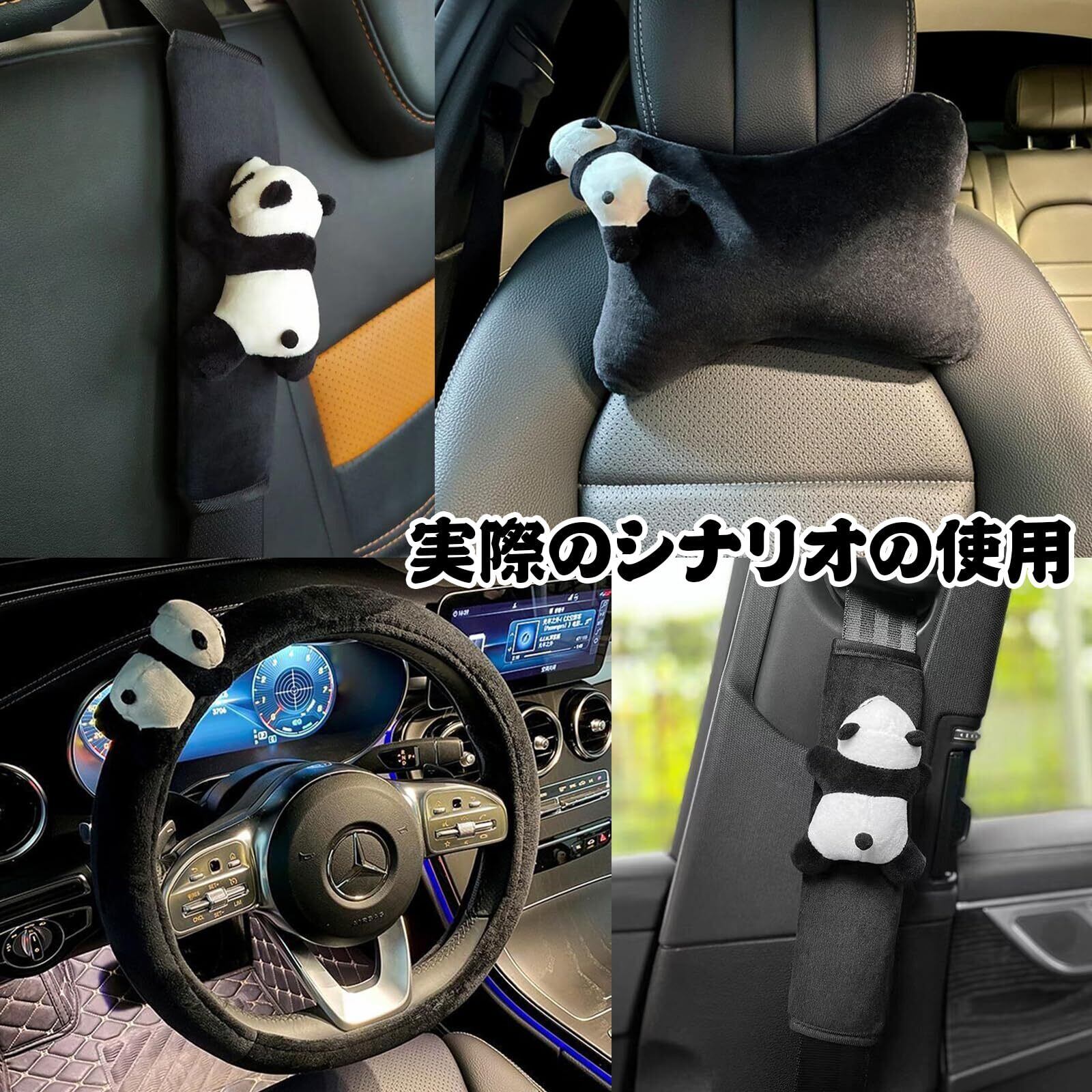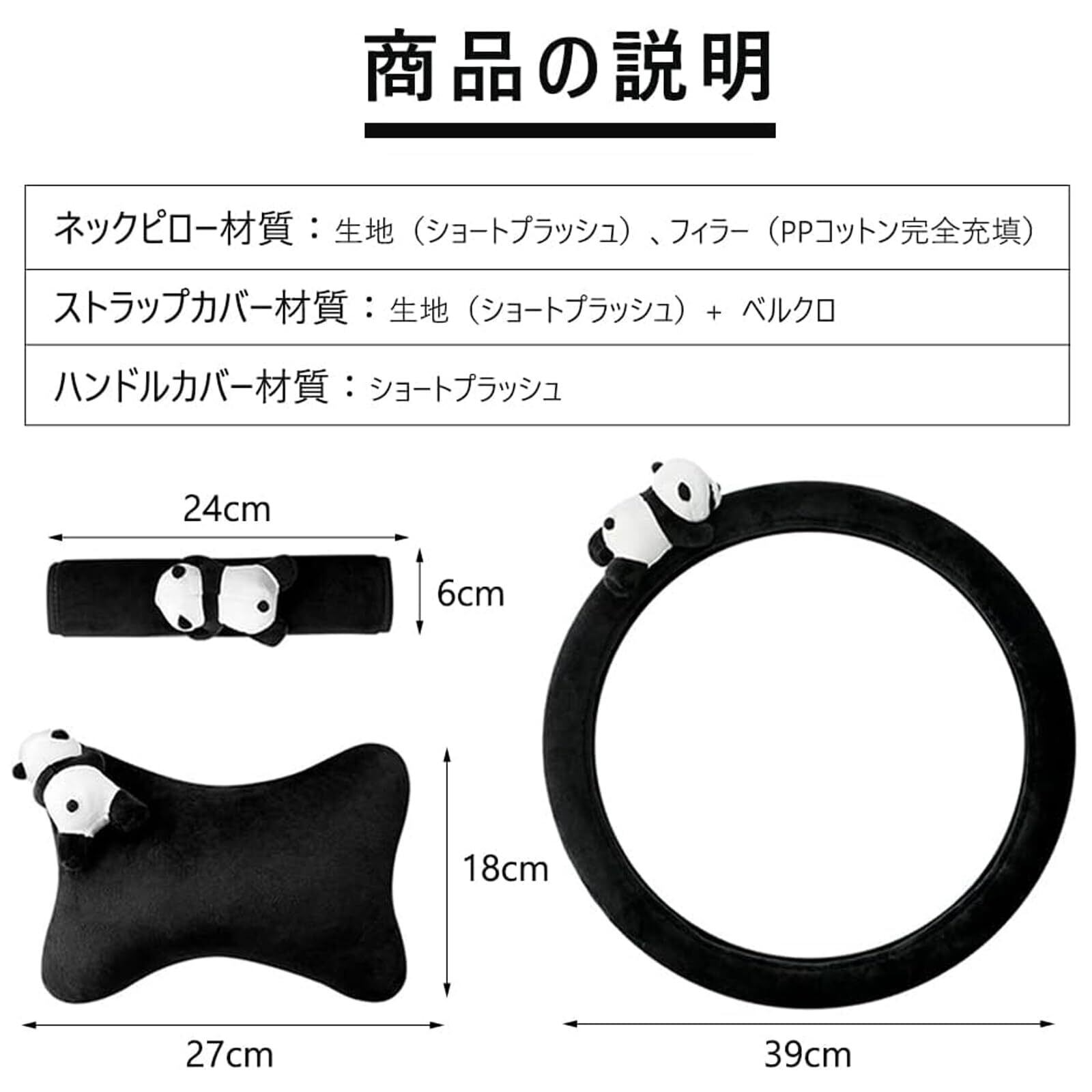 【仕様】含まれるもの パンダぬいぐるみ付き様式 車用ネックピロー2枚+ストラップカバー2枚+ハンドルカバー1輪 5セット。サイズ:ネックピロー:18*27cm、重さ179g1枚。ストラップカバー:24*6cm。ハンドルカバー:39*39cm、重さ602g。