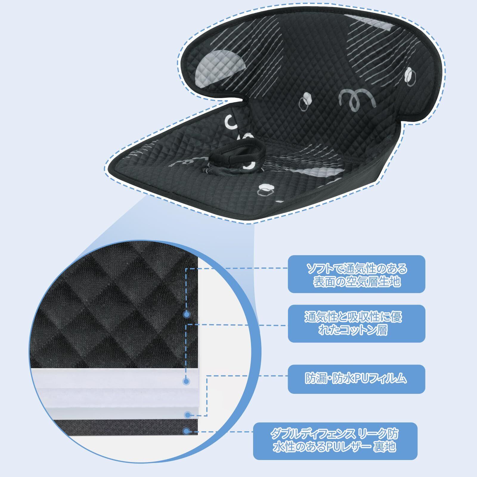 【お漏らし対策】】二重の防水素材(PUフィルム、PUレザー)で設計されており、おむつ漏れによる液体を裏面から底面への浸透を避けます。柔らかい直立シートベルトガードが股ハーネスを湿気や汚れから守り、深めの設計が液体やゴミの侵入を防ぎます。