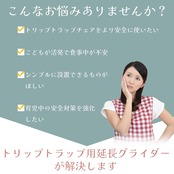 トリップトラップチェア対応の延長グライダーです。お子様の安全を第一に考え、チェアの安定性をさらに向上させる設計。後方への転倒リスクを軽減し安心してご使用いただけます。2003年以降の現行モデル(シリアル4~)に対応しています。