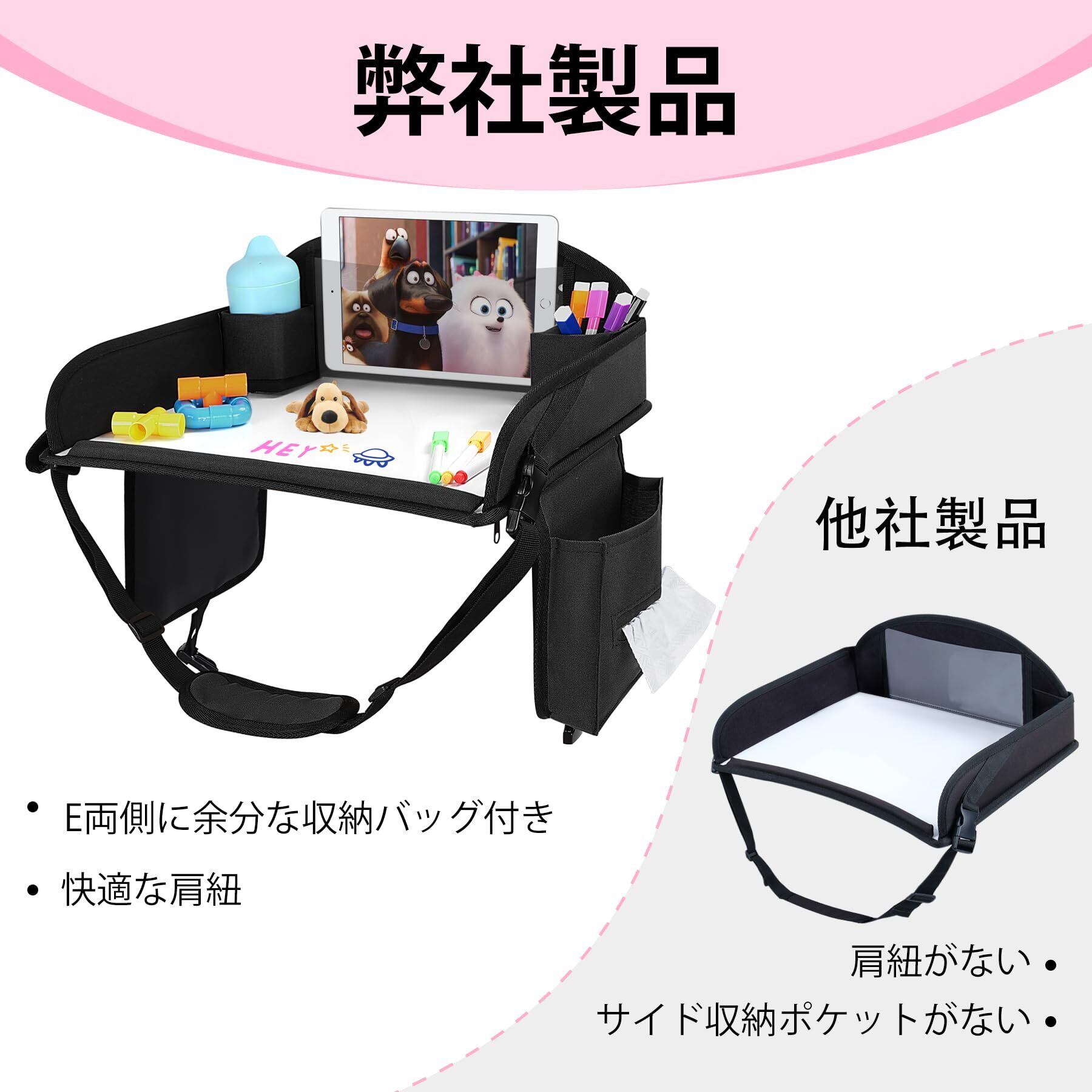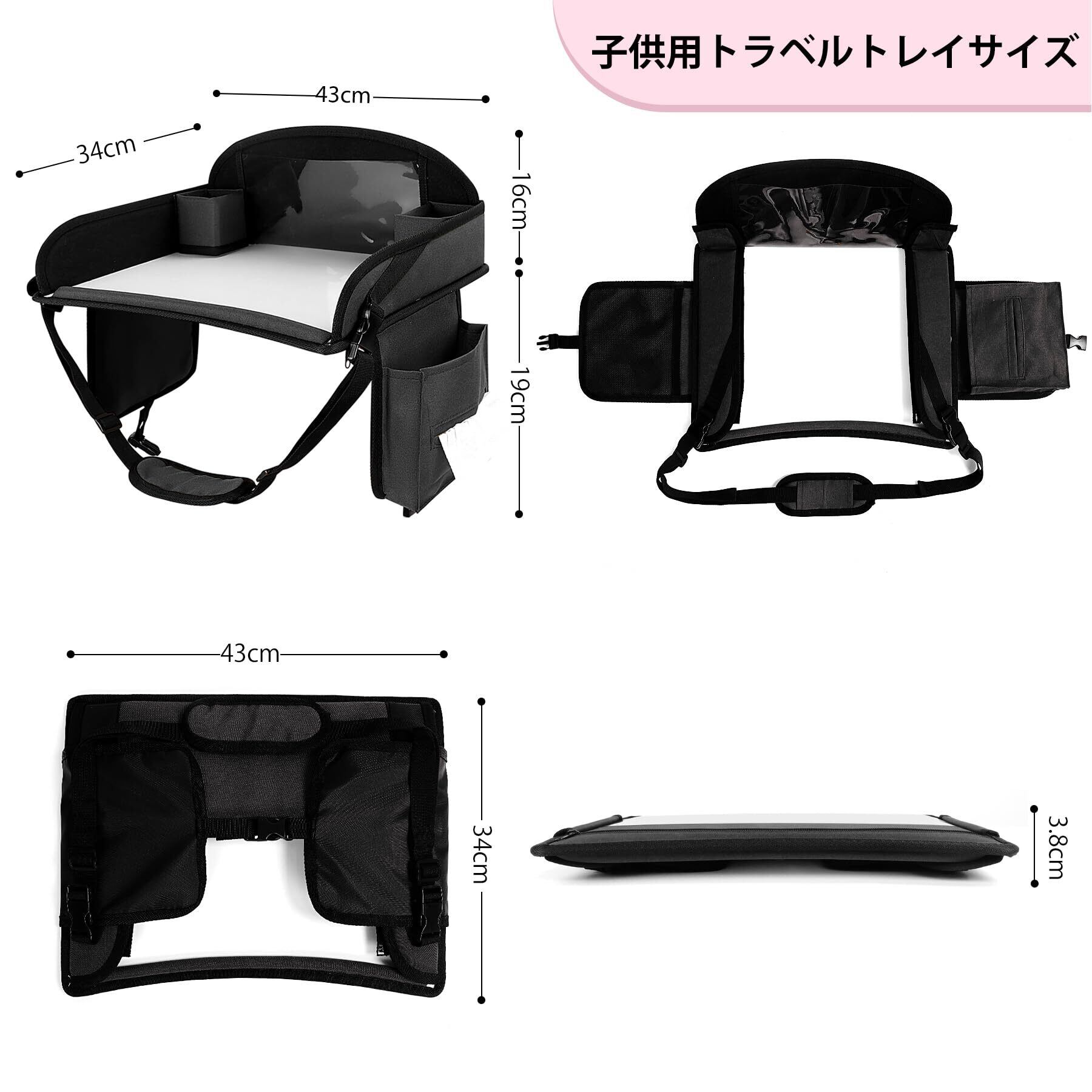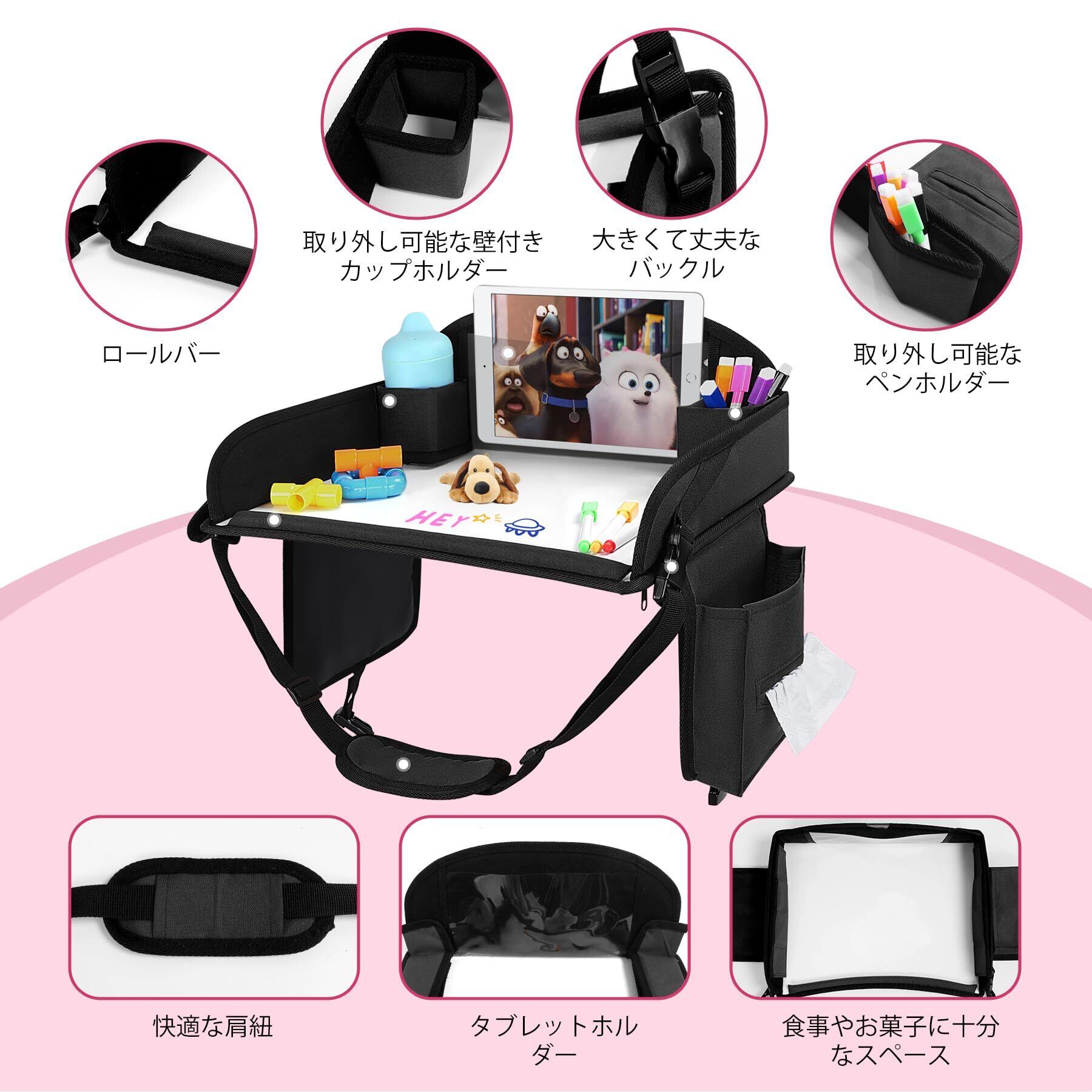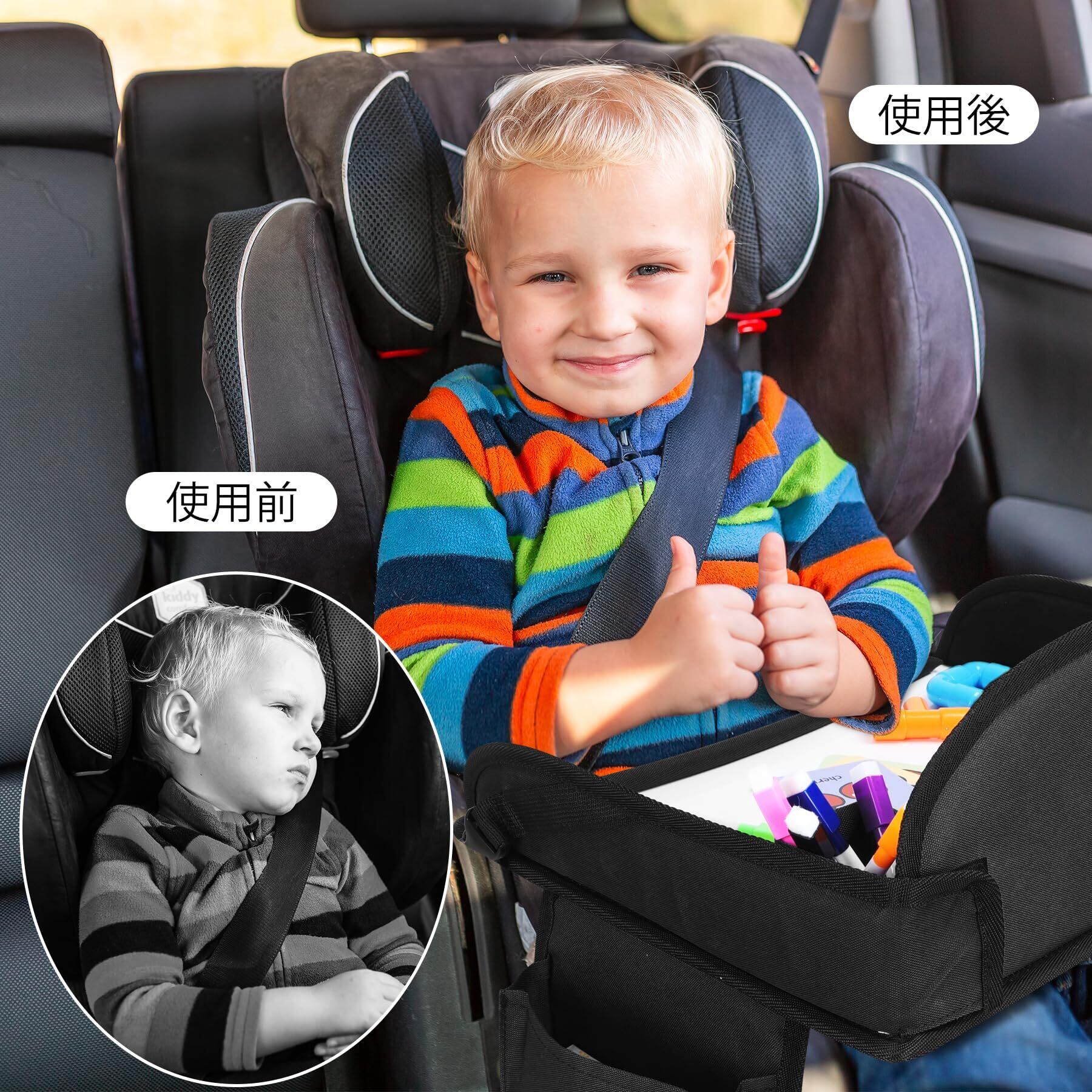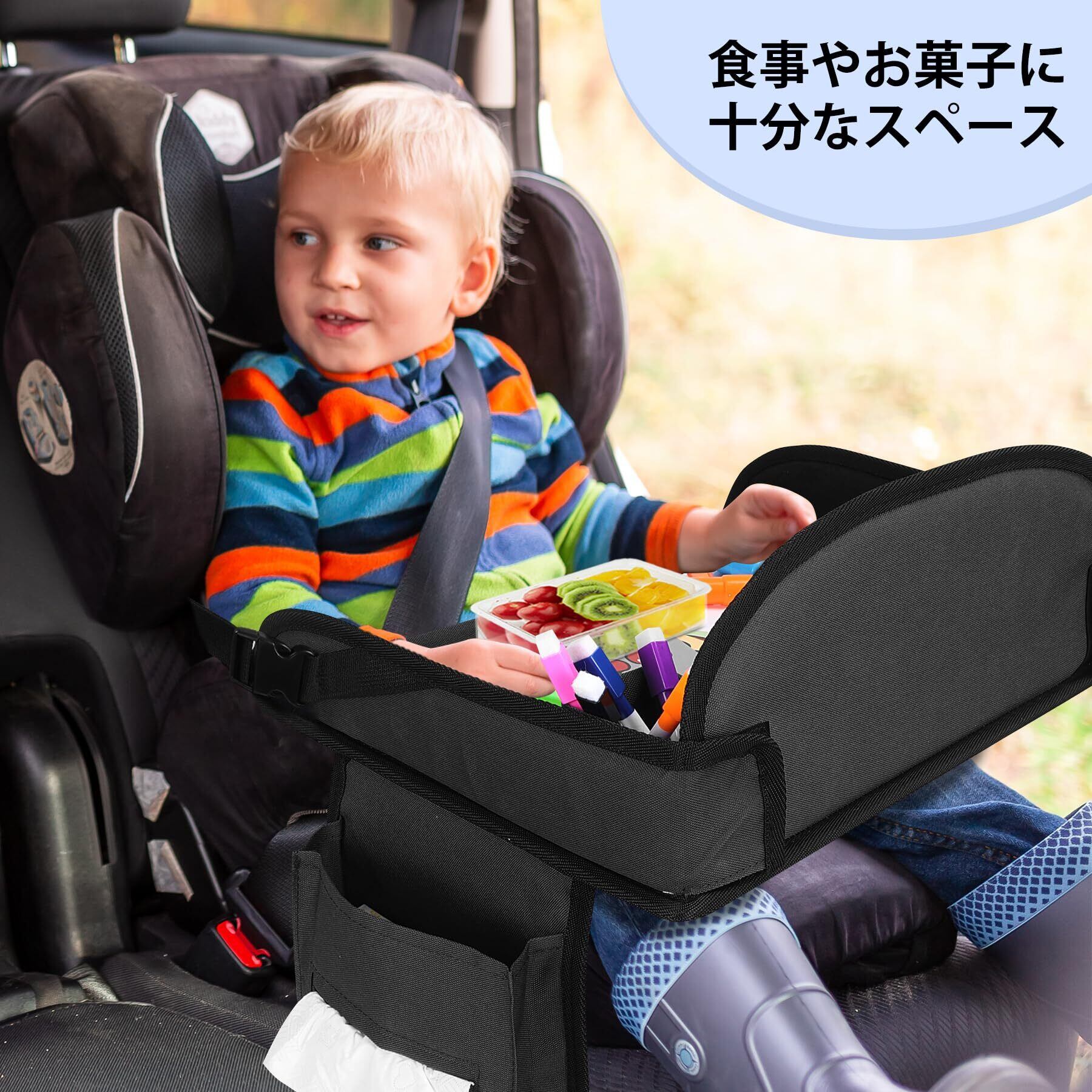 【チャイルドトレイテーブル】長距離の外出時に、お子様はこのトレイテーブルを使って、お絵かきをしたり、おもちゃで遊んだり、タブレットを見たり、食事をしたりすることができます。車内での時間を楽しく過ごすことができる、とても便利なアイテムです。