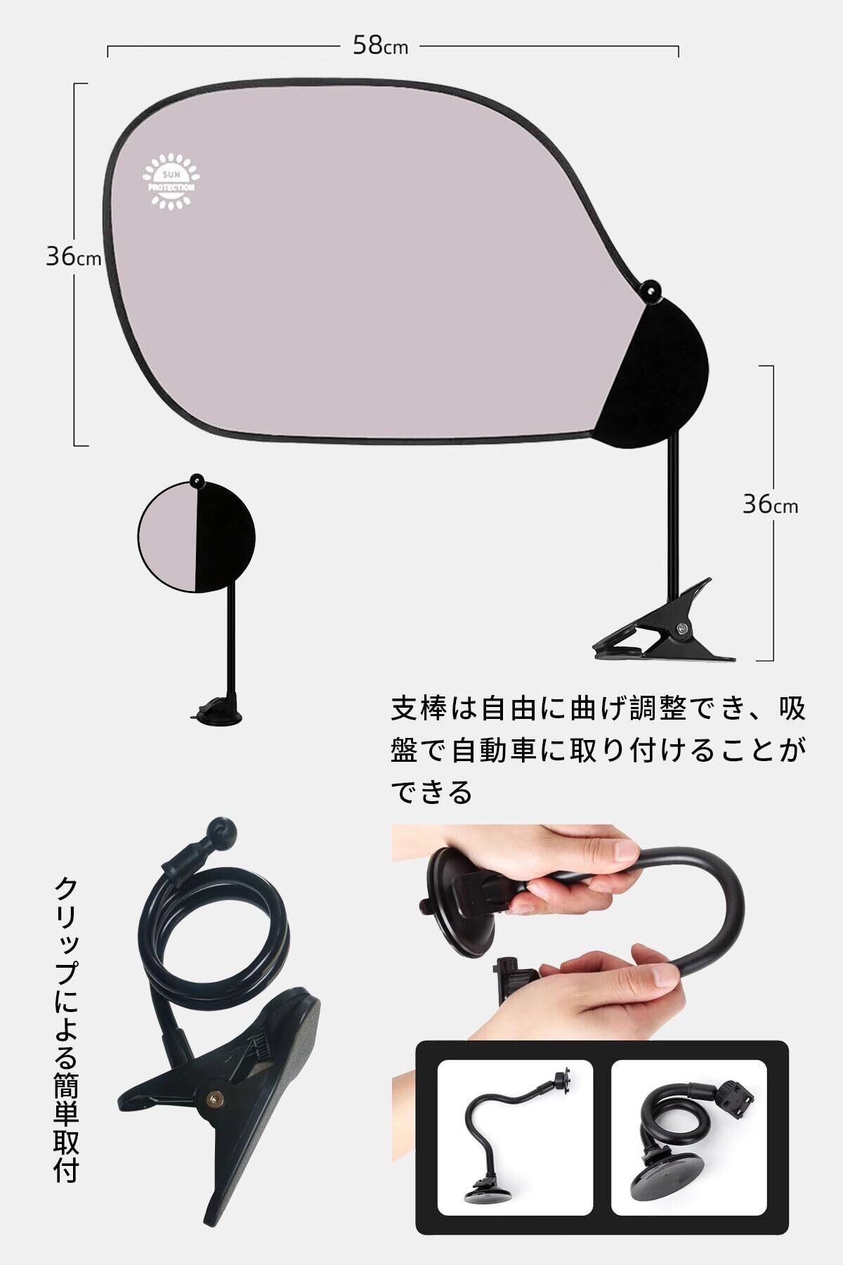 【サイズ】サンシェード ベビーカー 日除けシェード 幅広 車両用、長さ58cm、幅36cm。ブラケットハンドルの長さは36 cm。用途別のスタンドハンドルを2本組み合わせることができます、吸盤のハンドルホルダーとクリップハンドルホルダー。ハンドルブラケットは自由に折り曲げ可能、必要な角度に調整することができます、多目的に使用できる。家族が赤ちゃんを連れて快適に外出を楽しみましょう!