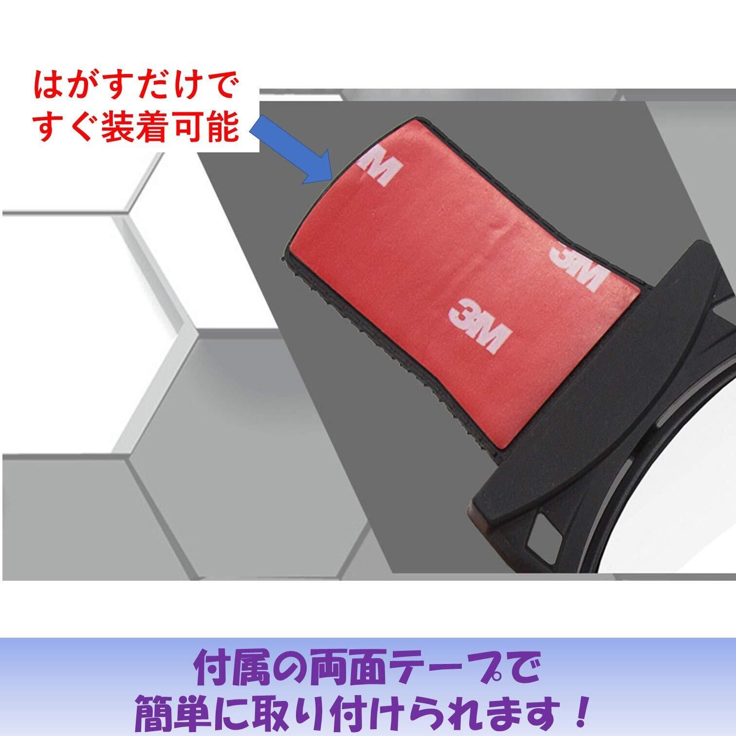 バックミラー背部に付属の粘着テープで取り付けるだけで視野角を広げることができます。取り付け後にミラーの角度は調節できますのでお好みのポジションにセットできます。