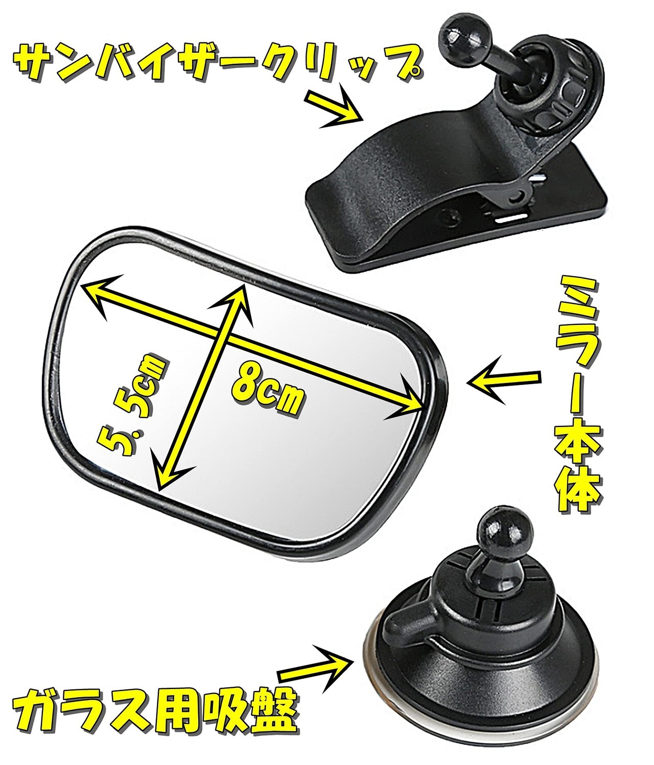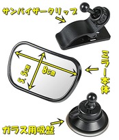 【セット内容】ルームミラー(鏡面サイズ 8x5.5cm)【2通りの装着方法】吸盤を使用しガラス面に、クリップを使用してサンバイザーに。