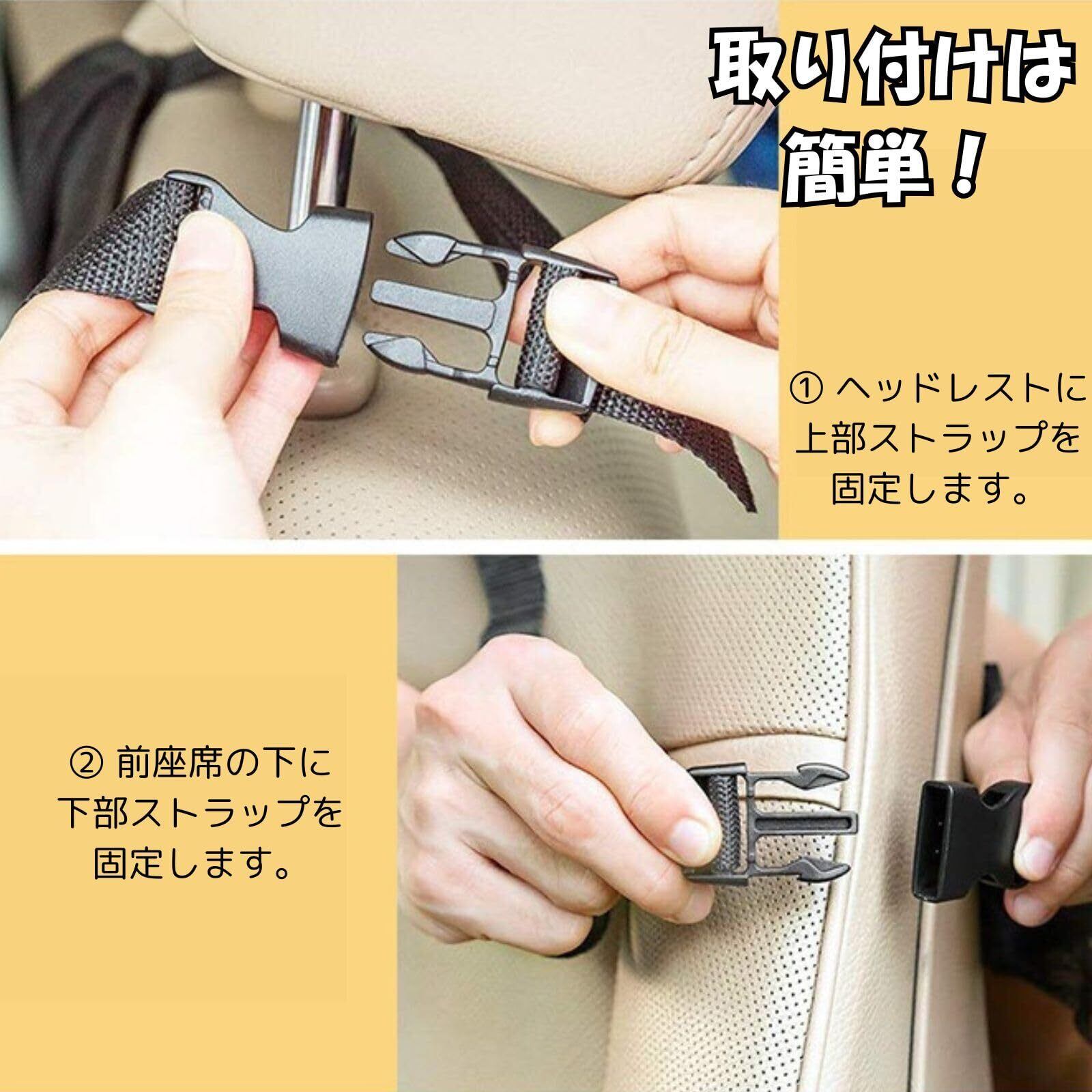 【取り付け簡単、すぐに使える】 ヘッドレストにベルトで固定し、さらにシートにもベルトで固定するだけの簡単装着。運転中に揺れにくく、誰でもすぐに設置できる使いやすいシートバック収納ポケットです。ブラックのシンプルなデザインで、どんな車内にもなじむのも嬉しいポイントです。