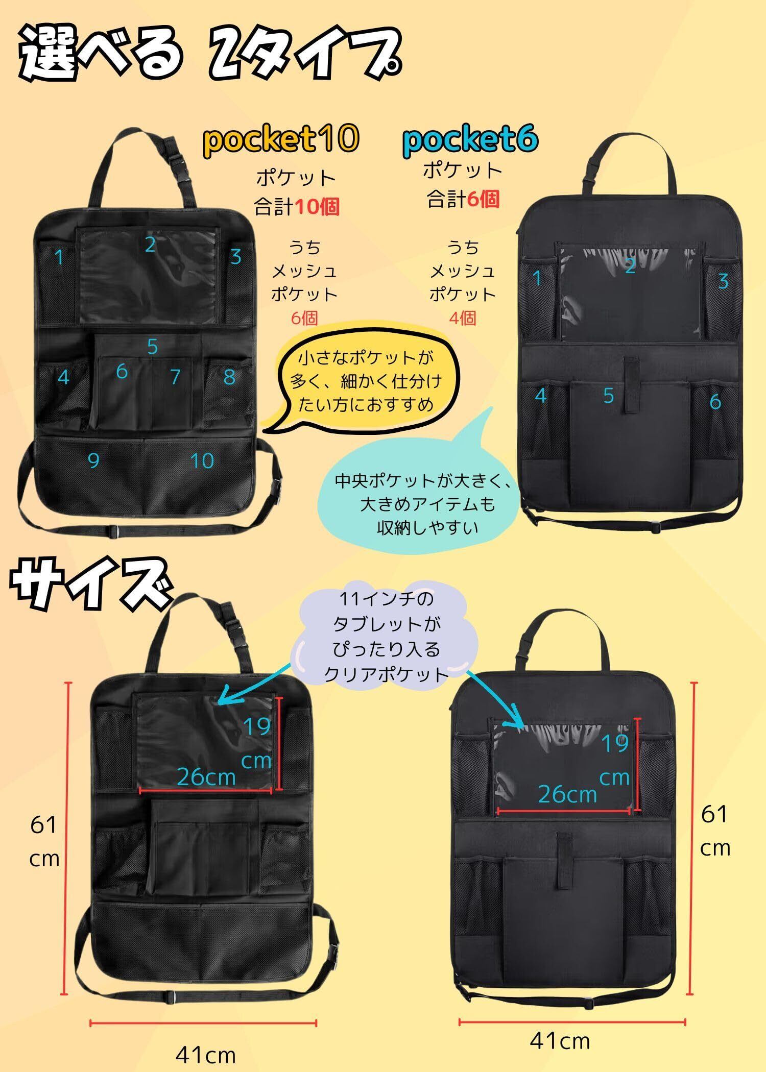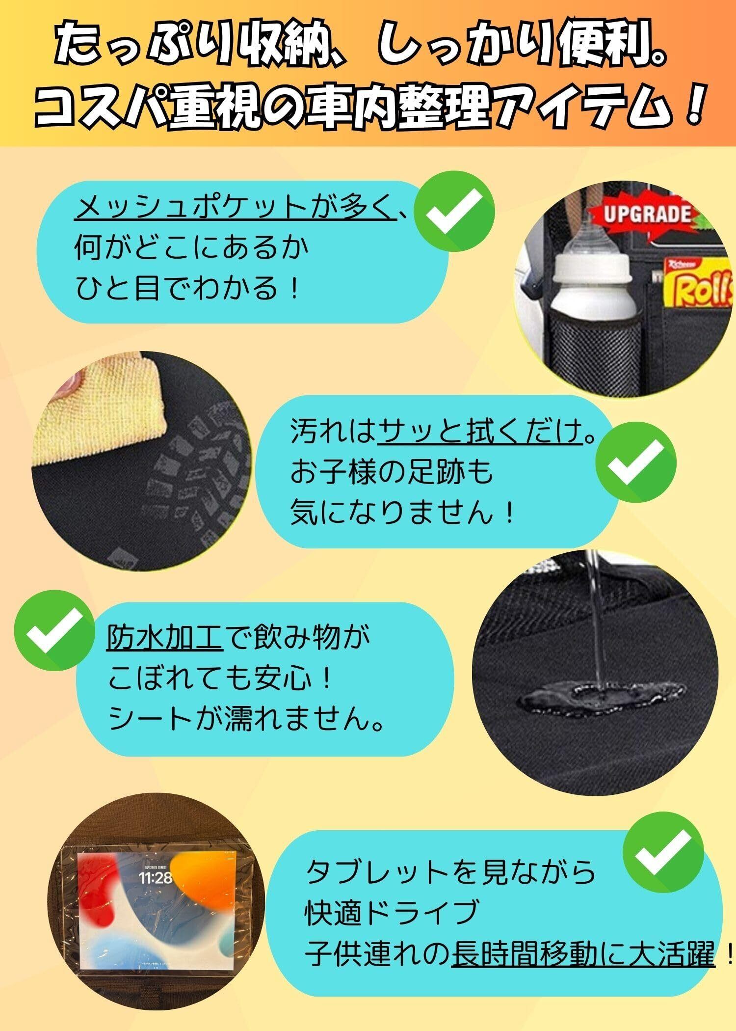 【ポケットたっぷりで車内スッキリ】後部座席まわりがごちゃつきがちな方にぴったり!このシートバックポケットは、大容量の多機能収納でおもちゃや飲み物、文具まできれいに整理できます。車内グッズをスマートにまとめて、いつでも清潔な空間に。ファミリードライブのお供におすすめです※こちらはポケット6の商品です。 【防水仕様で汚れにも安心】ドリンクのこぼれや子供のおやつで汚れても大丈夫!オックスフォード素材を使用し、しっかり防水加工です。お手入れもさっと拭くだけなので、毎日の使用でも安心してお使いいただけます。 【タブレットも収納できる透明ホルダー】長距離ドライブの救世主!クリアポケットはタブレットホルダーとして使えるので、お子様が後部座席で動画を楽しむのに最適。走行中の子供の退屈対策にも大活躍です! 【家族みんなが使いやすい設計】 子供のおもちゃから大人の小物まで整理できる万能設計。後部座席の収納に困っていた方も、このアイテムで驚くほど快適になります。ファミリーカーにぴったりな便利グッズとして、ぜひお試しください! 【取り付け簡単、すぐに使える】 ヘッドレストにベルトで固定し、さらにシートにもベルトで固定するだけの簡単装着。運転中に揺れにくく、誰でもすぐに設置できる使いやすいシートバック収納ポケットです。ブラックのシンプルなデザインで、どんな車内にもなじむのも嬉しいポイントです。