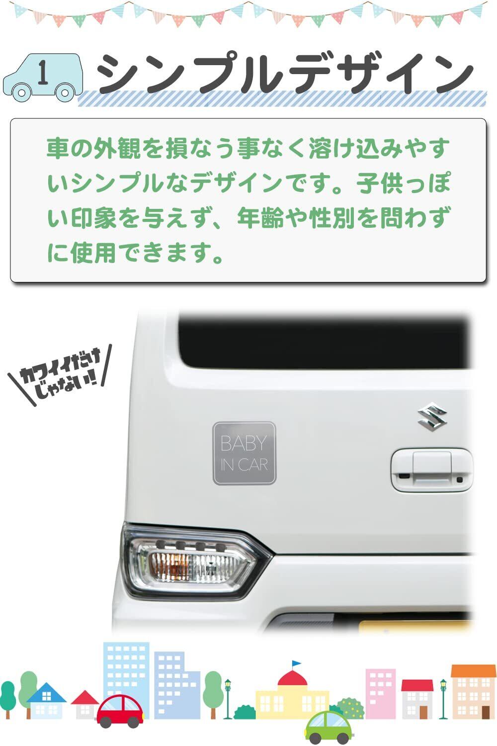【 洗練されたシンプルデザイン 】車の外観を損なう事なく溶け込みやすいシンプルなデザインです。子供っぽい印象を与えず、年齢や性別を問わずに使用できます。後続車へ赤ちゃんが乗車している事を知らせ、安全第一で運転している事を知らせます。煽り運転や無理な追い越しを防ぐ効果を期待出来ます。