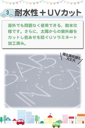 【 耐水性+UVカット 】屋外でも問題なく使用出来る耐水仕様です。さらに、太陽からの紫外線をカットし色あせを防ぐ、透明フィルムによるUVラミネート加工済み。雨が降っても、強い日差しが当たっても問題ありません。