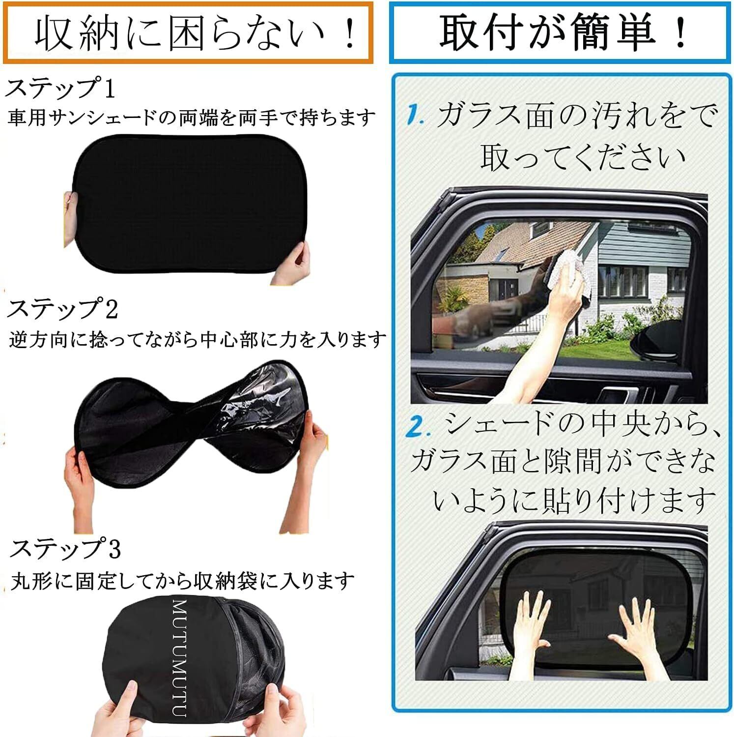 MuTuMuTu 車用サンシェード 静電式タイプ サイド 日除け サンシェード 車 運転席 助手席 後部座席 UVカット 目隠し 車内 ペット 赤ちゃん 遮光 断熱 折りたたみ 簡単着脱 コンパクト 収納バッグ付き(2枚セット 44cmx38cm)
