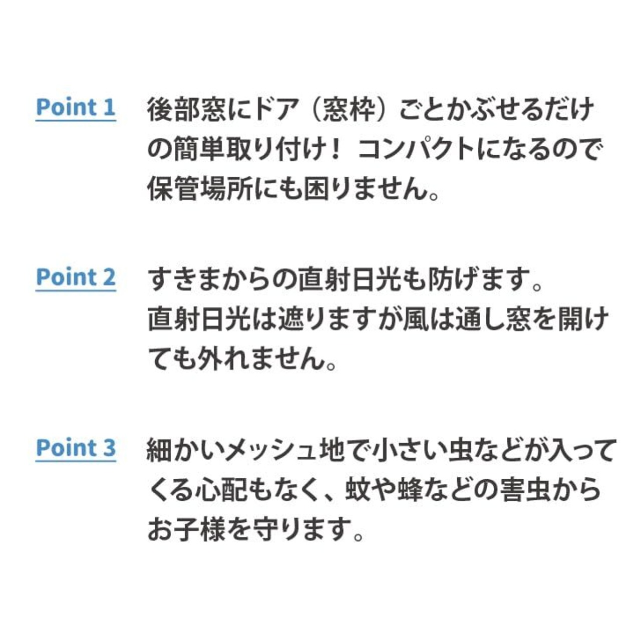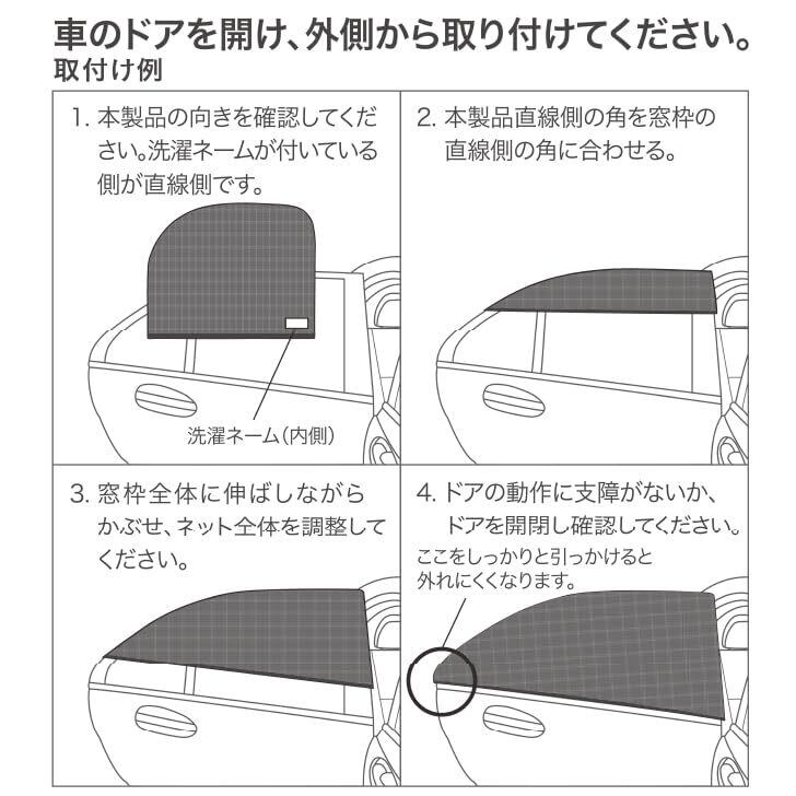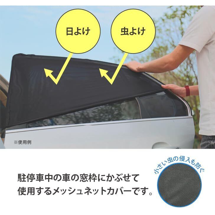 本製品は駐停車中の車の窓枠にかぶせて使用する日よけ、虫よけ用メッシュネットカバーです。後部窓にドア(窓枠)ごとかぶせるだけの簡単取り付け。直射日光は遮り、風は通します。窓を開けても外れません。車内で快適に過ごせます。窓枠ごとかぶせるのですきまからの直射日光も防げます。細かいメッシュ地で小さい虫などが入ってくる心配もなし! 蚊や蜂などの害虫からお子様を守ります。取り付けておくだけで、駐停車中の車内に日陰を作れます。コンパクトになるので保管場所にも困りません。