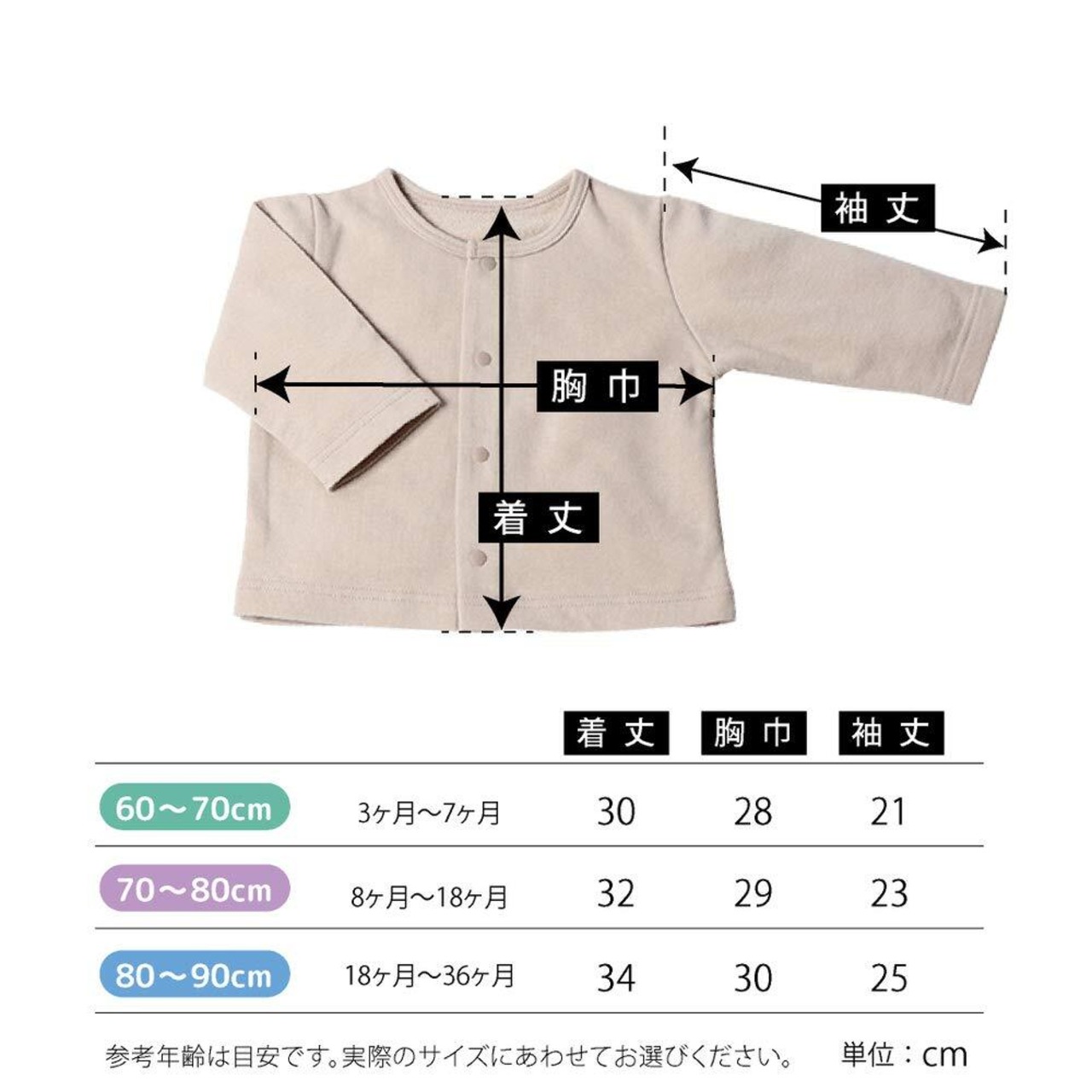 【サイズ】60~70㎝ 着丈30㎝ 身巾28㎝ 袖丈21㎝ 70~80㎝ 着丈32㎝ 身巾29㎝ 袖丈23㎝ 80~90㎝ 着丈34㎝ 身巾30㎝ 袖丈25㎝
