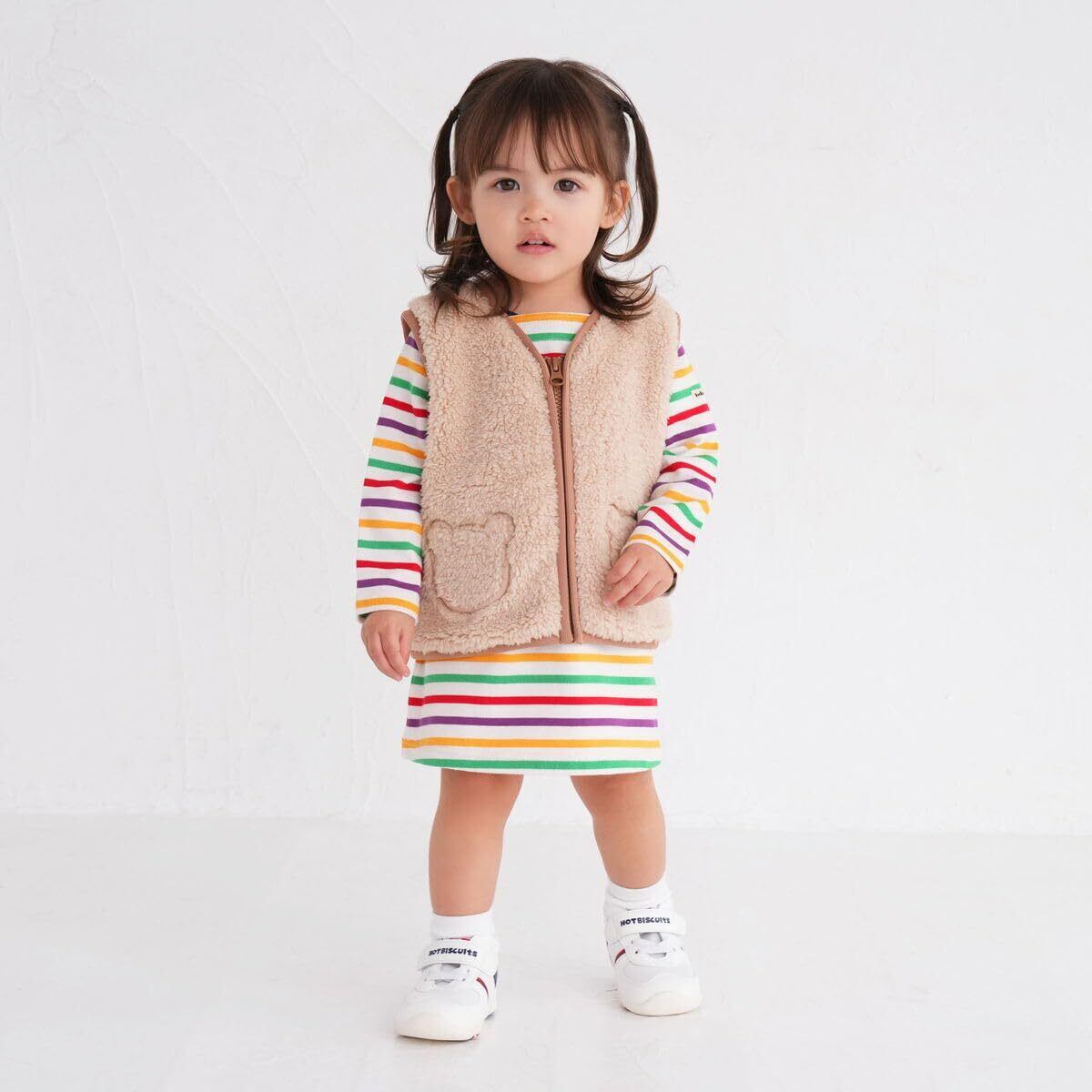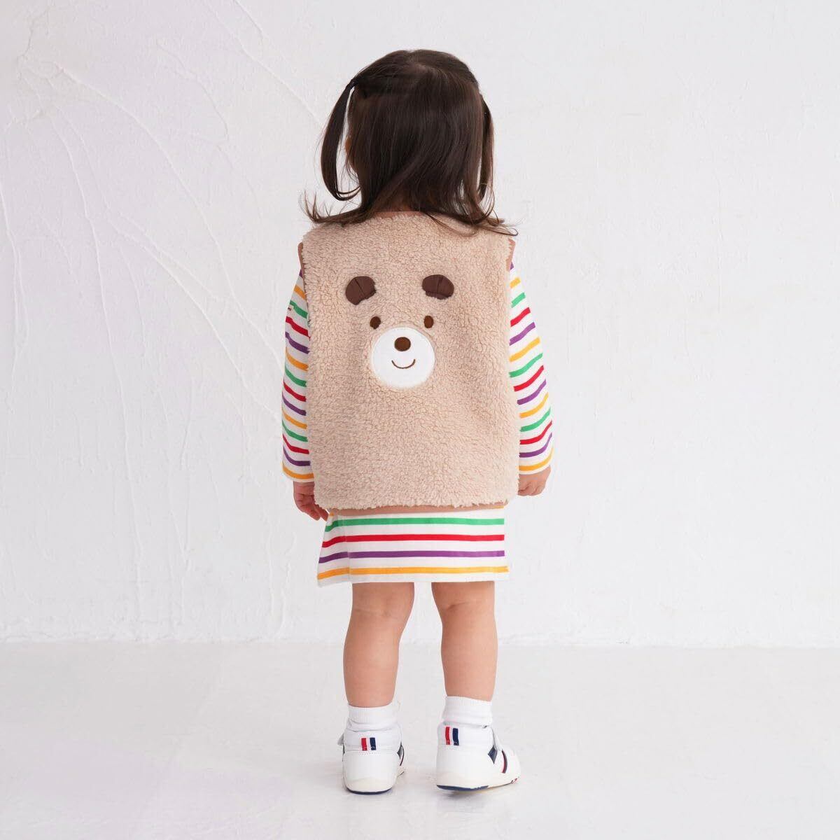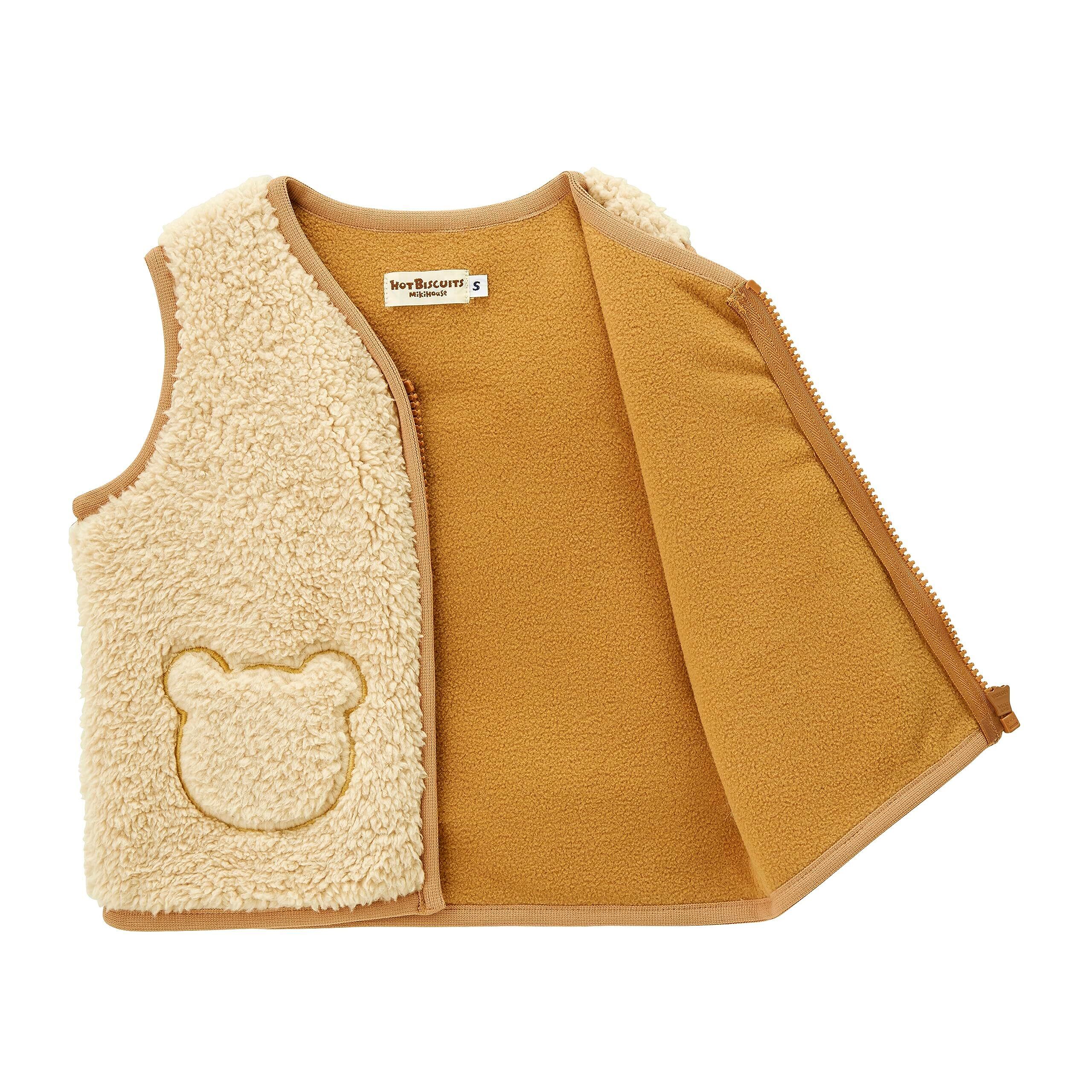 ミキハウス ホットビスケッツの顔ドン ボアベスト。 人気の顔ドンシリーズから、ふわふわのボアが見た目・着心地ともに暖かなベストが登場! 背中のくまちゃんのお顔が目を引くかわいいデザイン。 茶色のパイピングや、くまシルエットの刺繍がアクセントになっています。