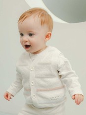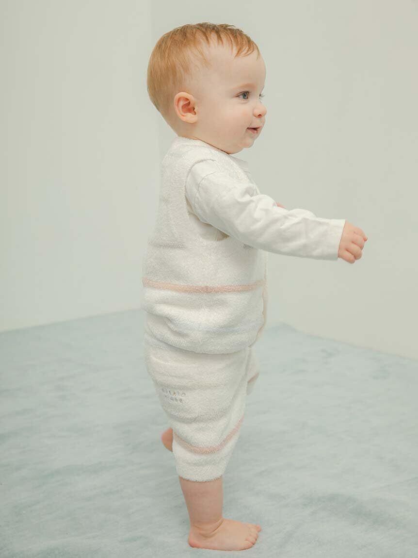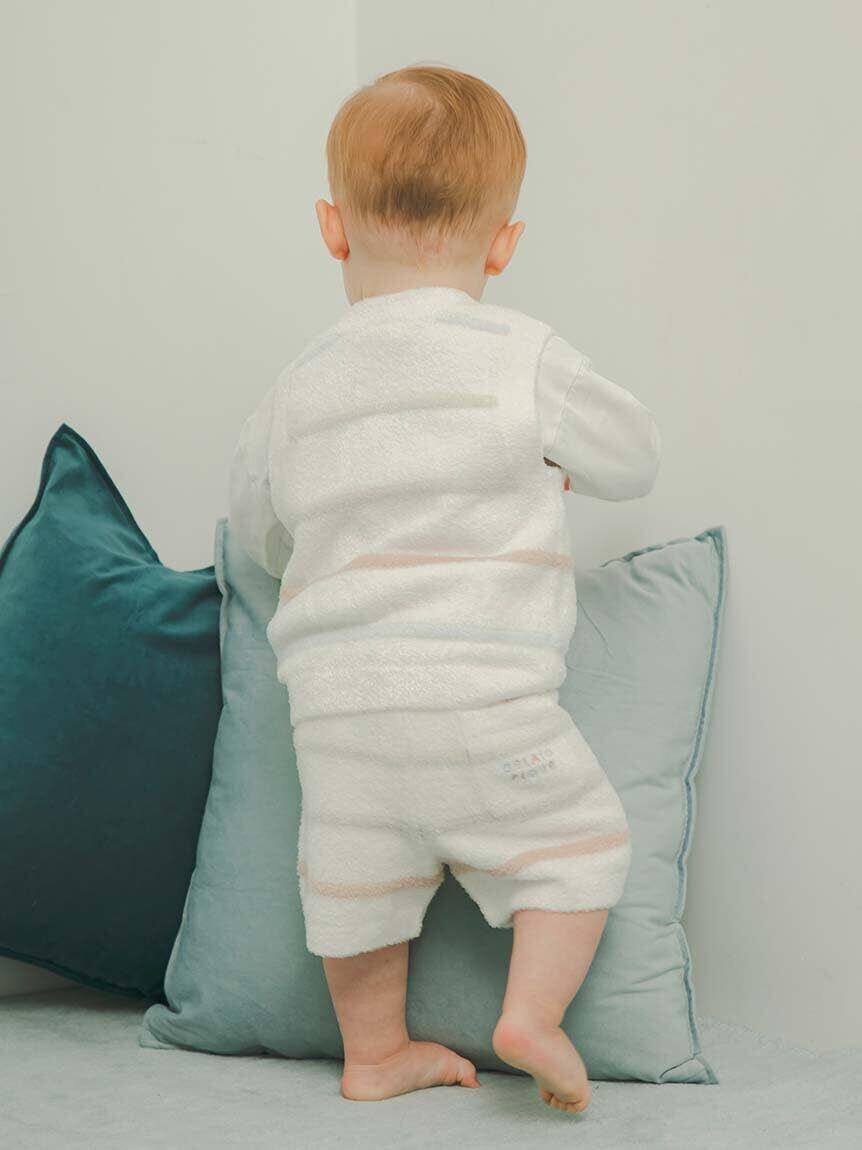 ぷっくりとした編み地のボーダー柄がキュートな、親子で楽しめる'スムーズィー'のニットシリーズです。動きやすく、ロングシーズン着用できるBABYベストは動きたい盛りのお子様におすすめしたいアイテムです。吸水機能に優れた糸を使用しているので、汗を素早く吸って快適な肌触りをキープします。左裾に入ったカラフルなロゴ刺繍もポイント。優しい色みのボーダー柄で、春らしい着こなしをお楽しみください。色はオフホワイトとピンクの2色をご用意しました。同シリーズのショートパンツや、同時期に展開するデイジー柄、ダイナソー柄のウェアと合わせるのもおすすめ。LADIES、KIDSでもシリーズ展開しているので、親子でリンクコーディネートをお楽しみいただけます。