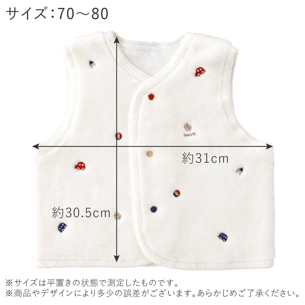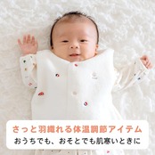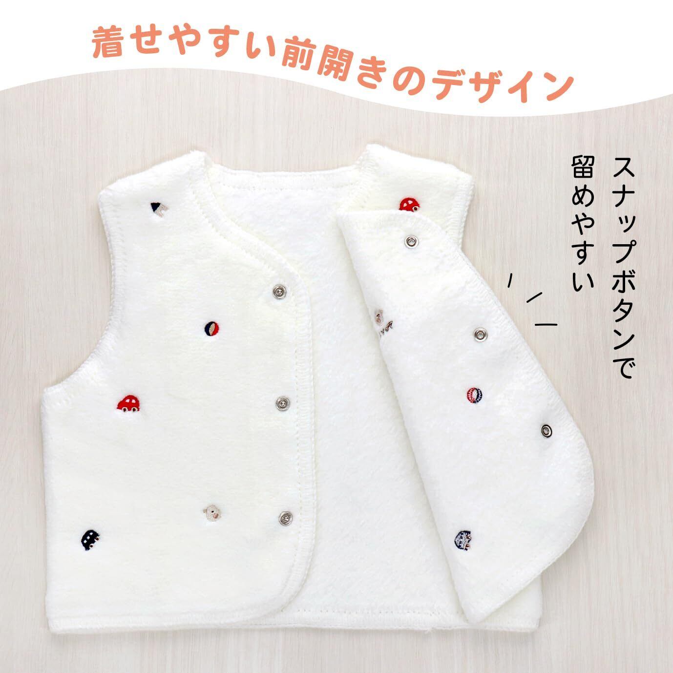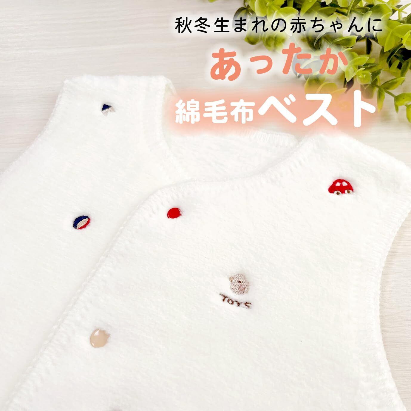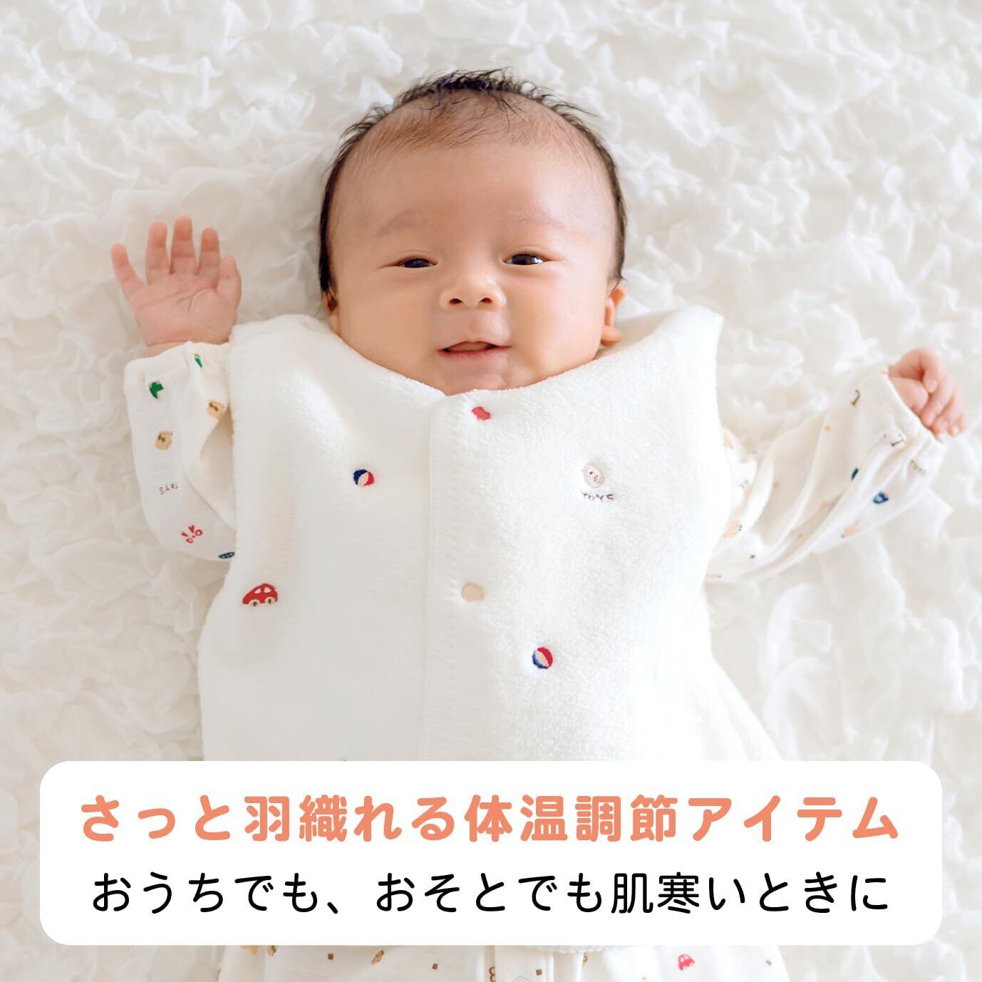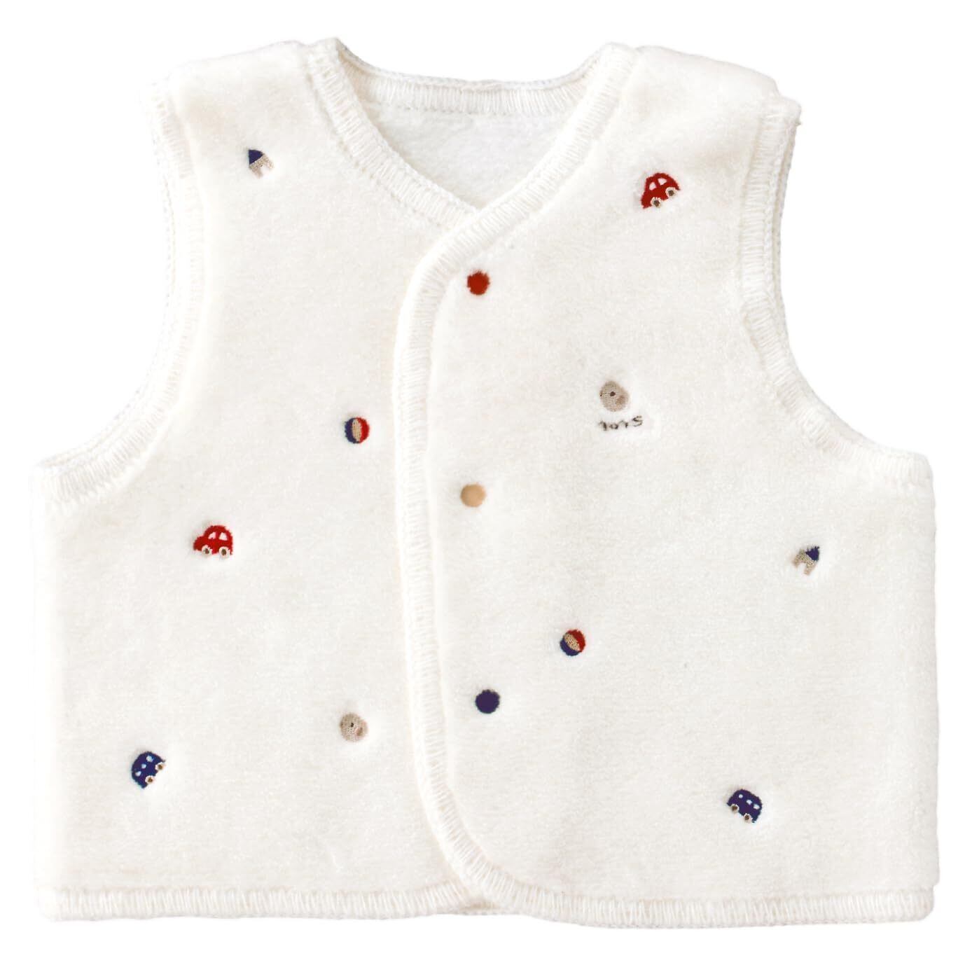 ひよこや積み木、車などのかわいい刺繍をちりばめたベスト。綿毛布生地のふんわりやわらかな肌触りです。おうちの中でもおそとでも手軽に羽織れ、赤ちゃんの体温調節に便利なアイテムです。