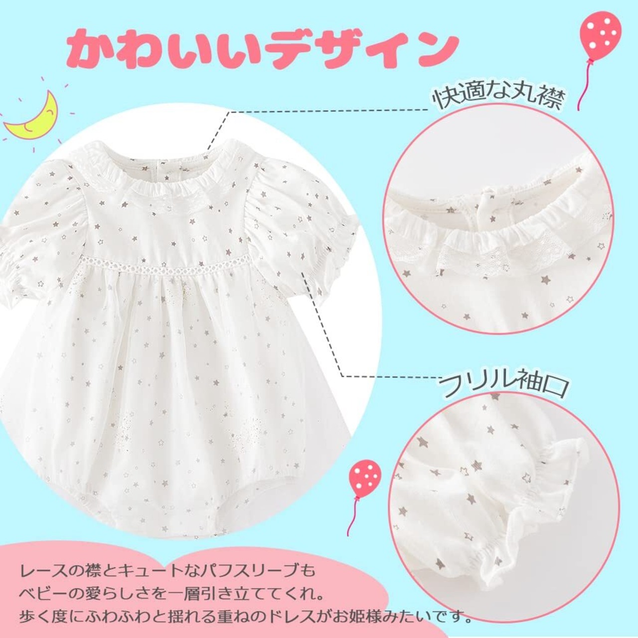 デザイン‐キラキラするふんわりシルエットのスカートが可愛いボディスーツです。キュートなパフスリーブもベビーの愛らしさを一層引き立ててくれます。歩く度にふわふわと揺れる重ねのドレスがお姫様みたいです。