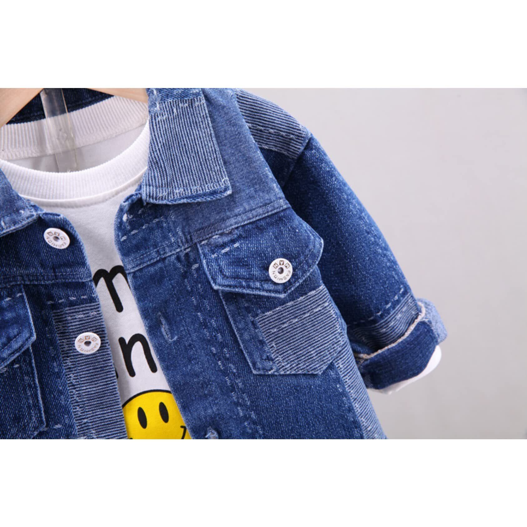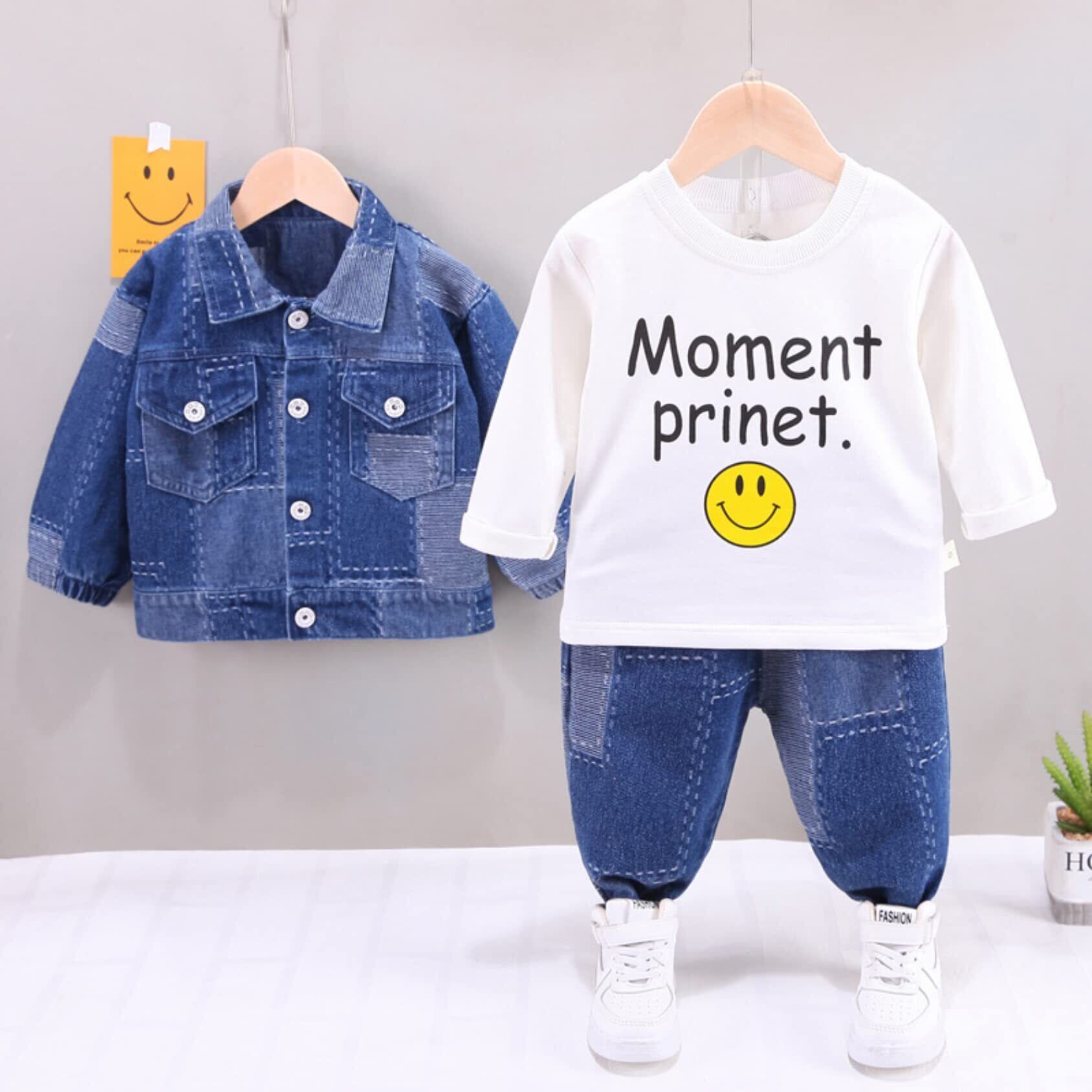 【春秋冬しっかり使える/普段着に活躍】お出かけに気軽におしゃれを楽しめるデニムの上下セットアップ。スマイル柄のTシャツがキュートでインパクト絶大なので可愛くファッションを楽しめるのはGOOD。届いたその日からコーデが楽しめる3点セット。