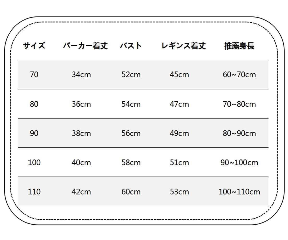 70cm:バスト52cm、着丈34cm、レギンス着丈45cm、推薦身長60~70cm