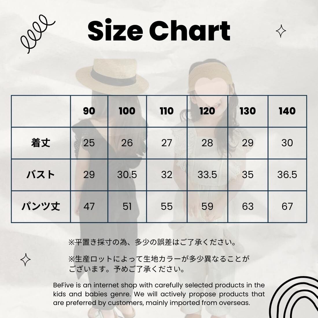 【サイズ】90cm、100cm、110cm、120cm、130cm、140cm ■90 size:着丈 25、バスト 29、パンツ丈 47 ■100 size:着丈 26、バスト 30.5、パンツ丈 51 ■110 size:着丈 27、バスト 32、パンツ丈 55 ■120 size:着丈 28、バスト 33.5、パンツ丈 59 ■130 size:着丈 29、バスト 35、パンツ丈 63 ■140 size:着丈 30、バスト 36.5、パンツ丈 67