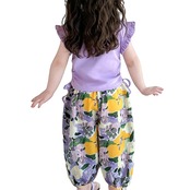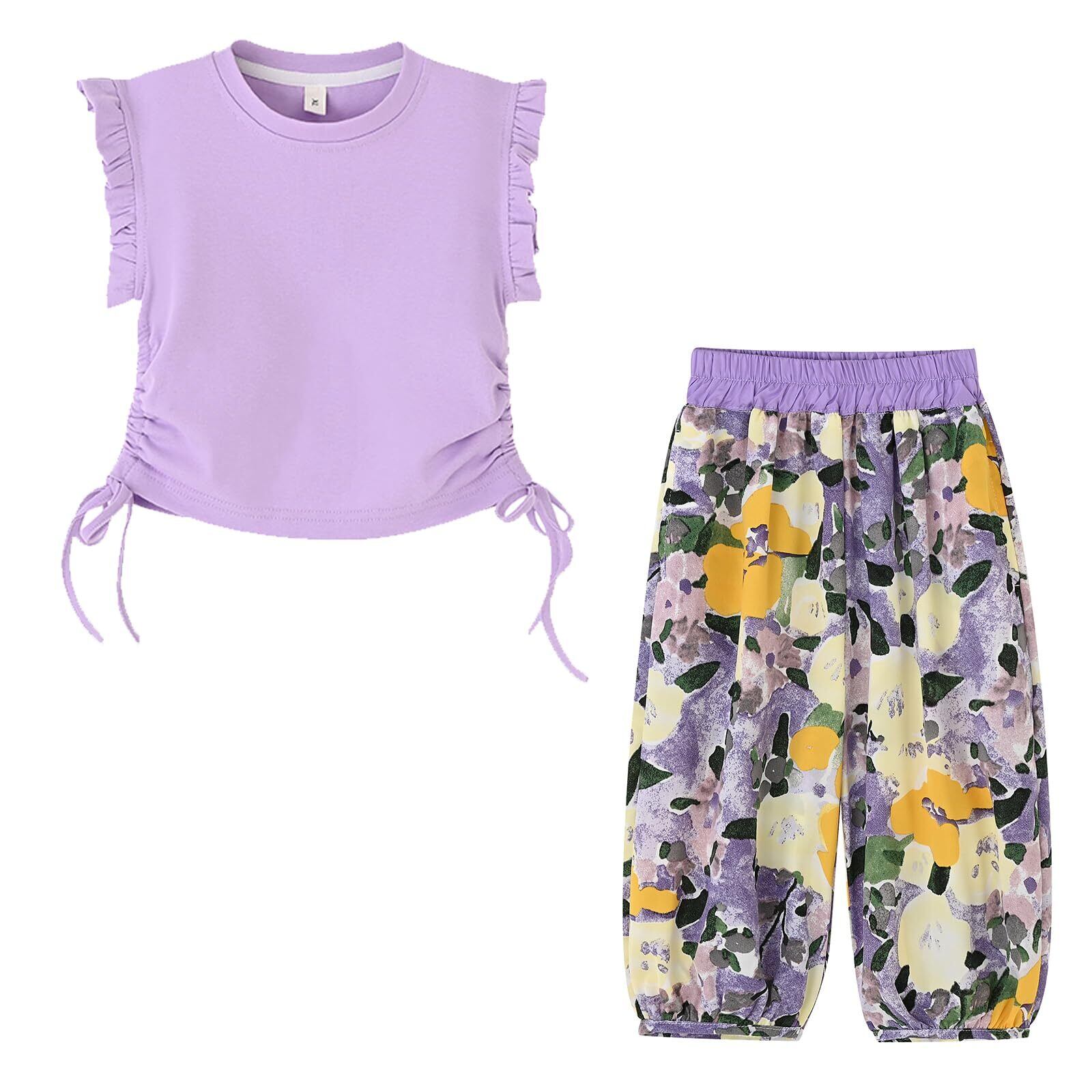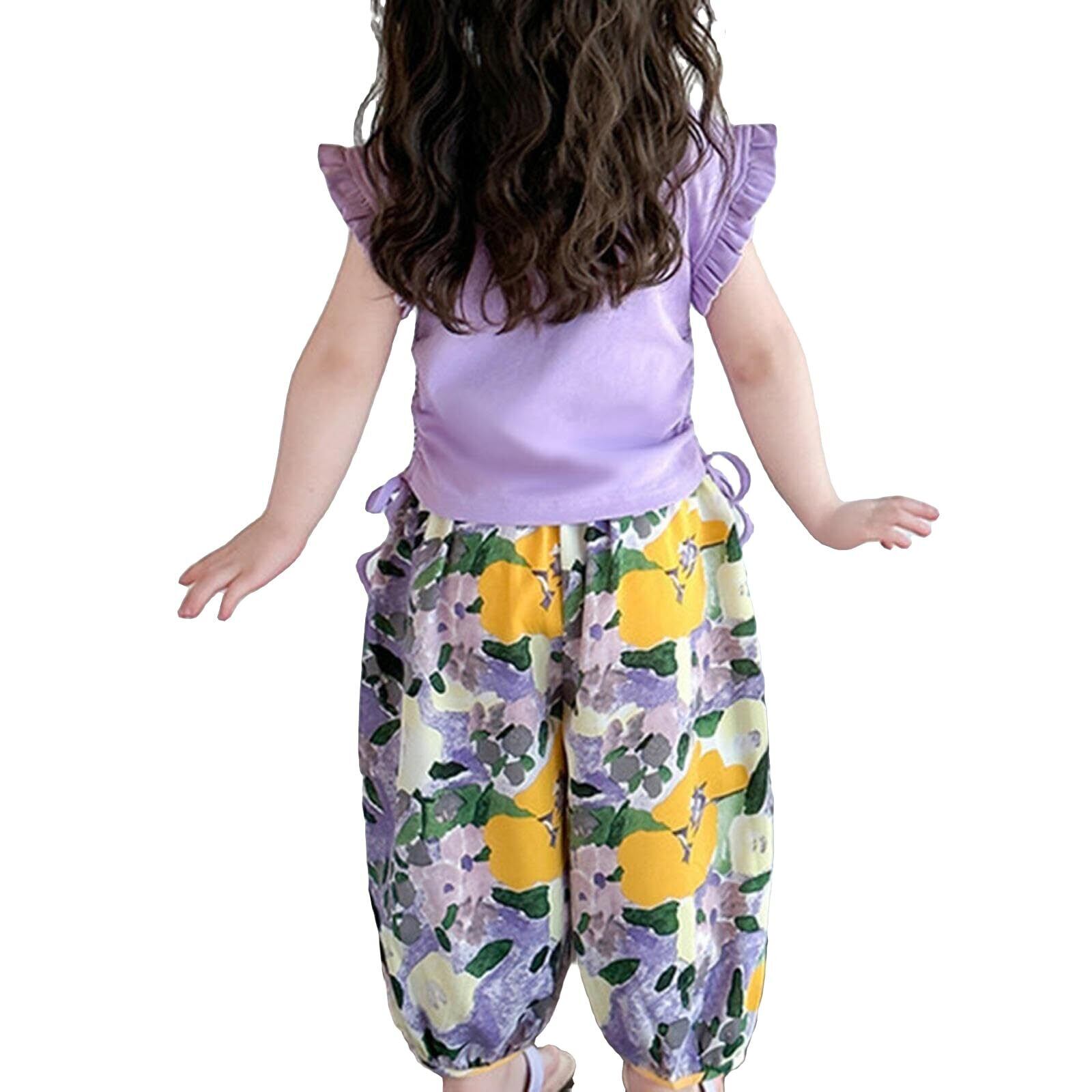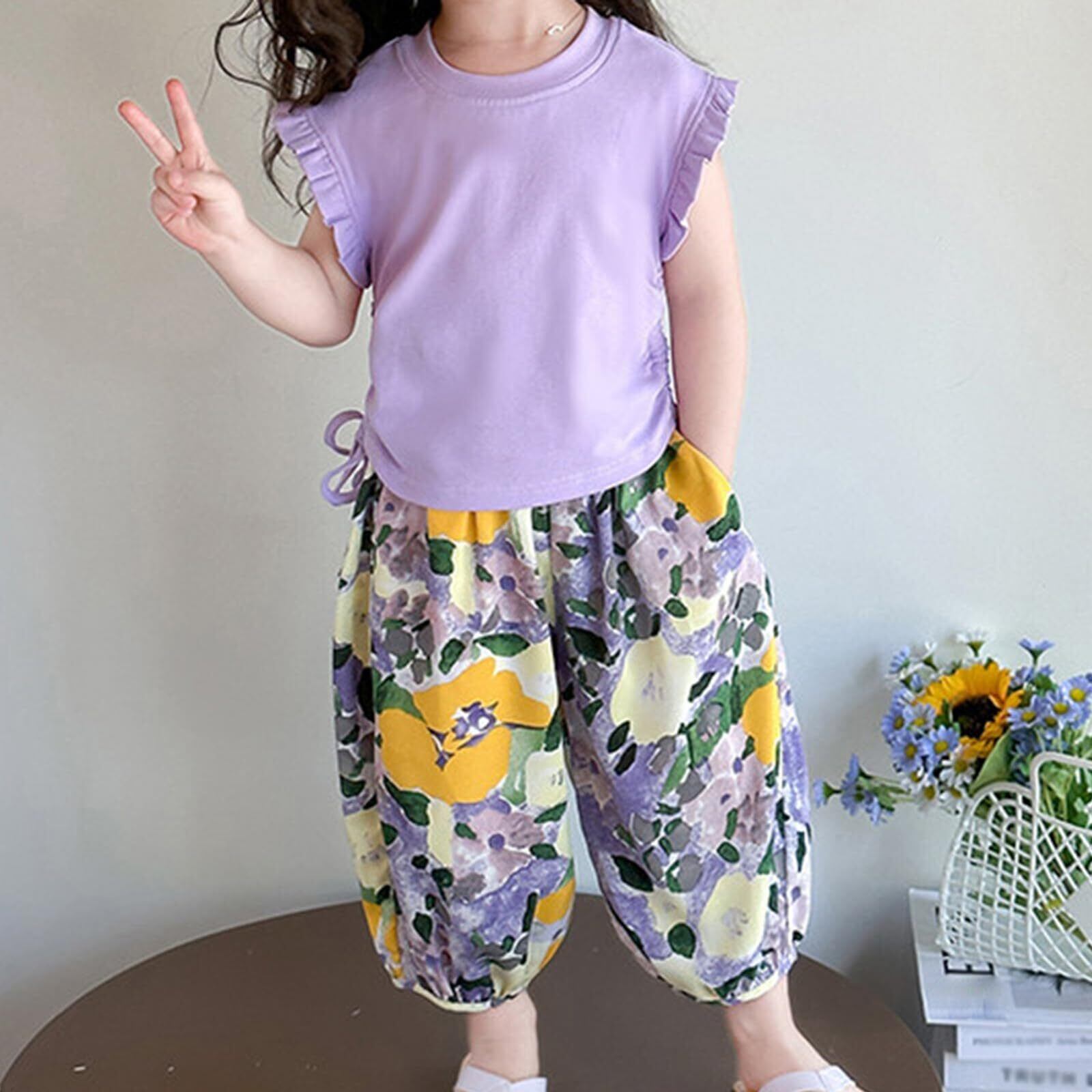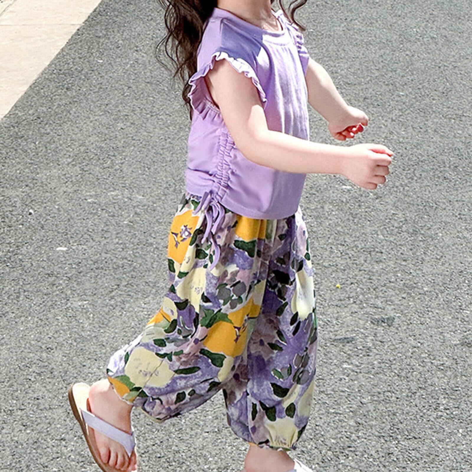 【特価セール】[YumeFlair] 子供服 女の子用2点セット カジュアルタンクトップ フリル袖の半袖 ファッションコットンTシャツ 涼しい柄のハレンパンツ 長ズボン キッズ 美しい かわいい 快適 速乾 春 夏 秋 90-140