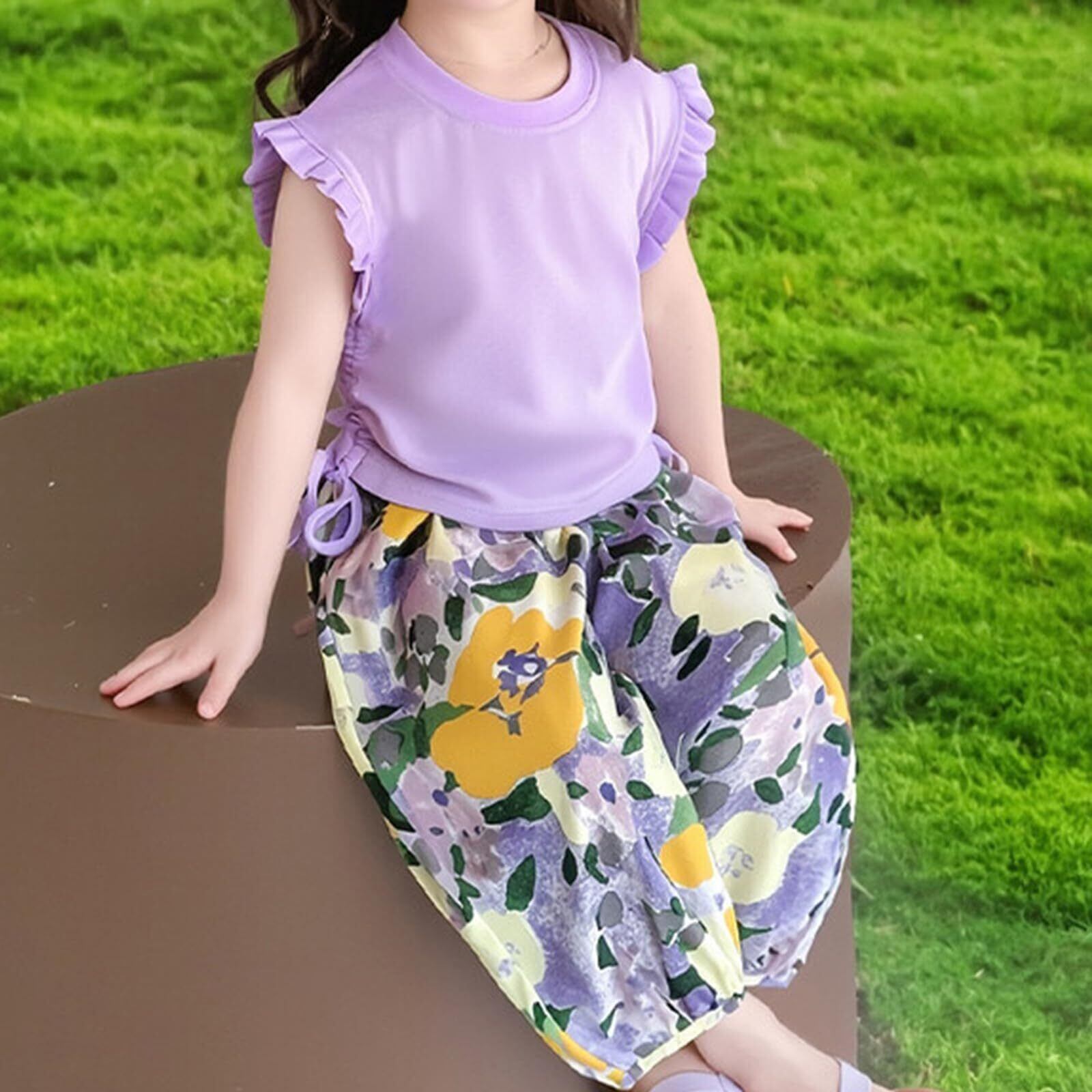 [YumeFlair] 子供服 女の子用2点セット カジュアルタンクトップ フリル袖の半袖 ファッションコットンTシャツ 涼しい柄のハレンパンツ 長ズボン キッズ 美しい かわいい 快適 速乾 春 夏 秋 90-140