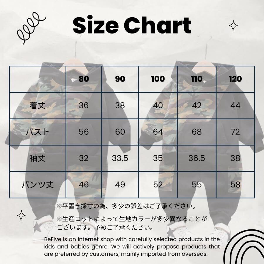 【サイズ】80cm、90cm、100cm、110cm、120cm ■80 size:着丈 34、バスト 29、パンツ丈 45 ■90 size:着丈 36、バスト 30、パンツ丈 48 ■100 size:着丈 38、バスト 31、パンツ丈 51 ■110 size:着丈 42、バスト 32、パンツ丈 54 ■120 size:着丈 44、バスト 33、パンツ丈 58