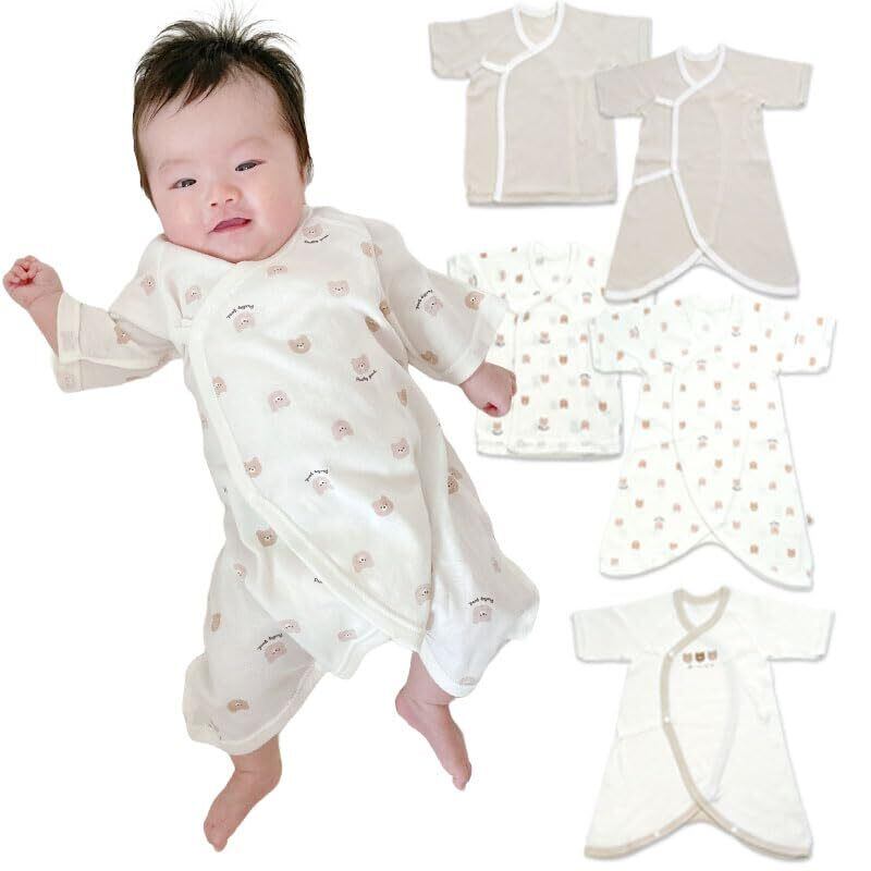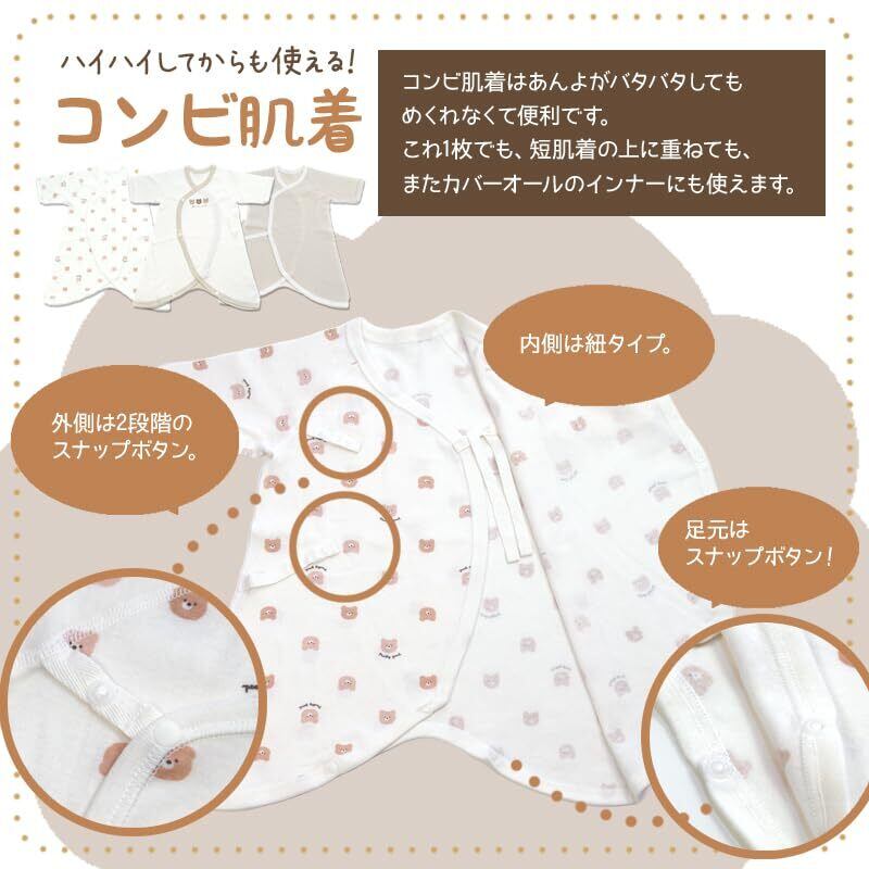 上質なインド綿を使用したオーガニックコットンの新生児肌着5枚組。 ナチュラルカラーにシンプルなクマのデザインで性別も選ばず、出産準備に最適。 肌に優しい有機素材なので敏感肌の赤ちゃんにもオススメです。