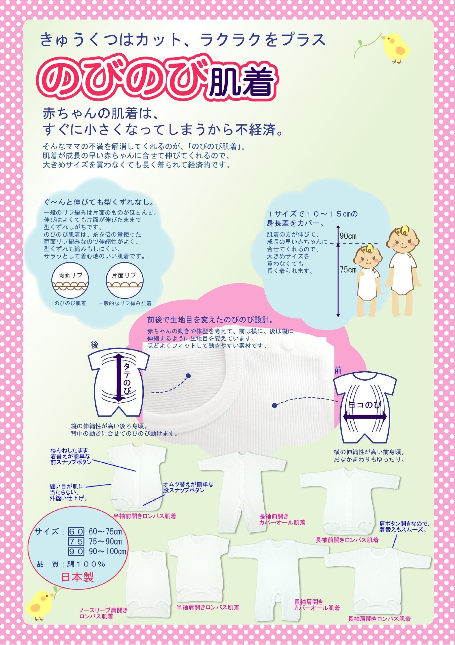 素材から縫製までこだわった日本製の肌着です。一般的なリブ編み肌着は生地の片面だけリブ編みになっているものがほとんどで伸びたまま戻らず型くずれすることがありますが、両面(裏表)がリブ編みになっている「両面リブフライス」は伸縮性がよく、型くずれや縮みがあまり無いしっかりした生地で、肌に触れる面が少ないのでサラッとしていて着心地の良い素材を使用しています。また、すぐに大きくなる赤ちゃんのために1サイズで10~15cmの身長差をカバーできるように体型や動きを考えて、前身頃はヨコに後身頃はタテに伸縮するよう生地目を変えてカッティングしてあり、前はヨコ伸びでおなかまわりがラクに、後は背中の屈伸がスムーズで、ほど良く体にフィットして動きやすく長く着られるよう工夫をしています。縫い目が肌に当たらないように外縫い縫製に仕上げています。頭からスッポリ簡単に着せられるロンパスタイプの肌着。ボタンは金属アレルギーに配慮してプラスチック製です。