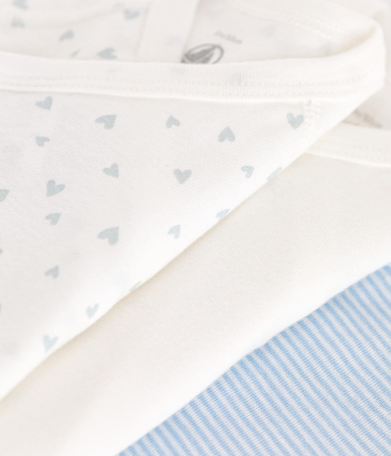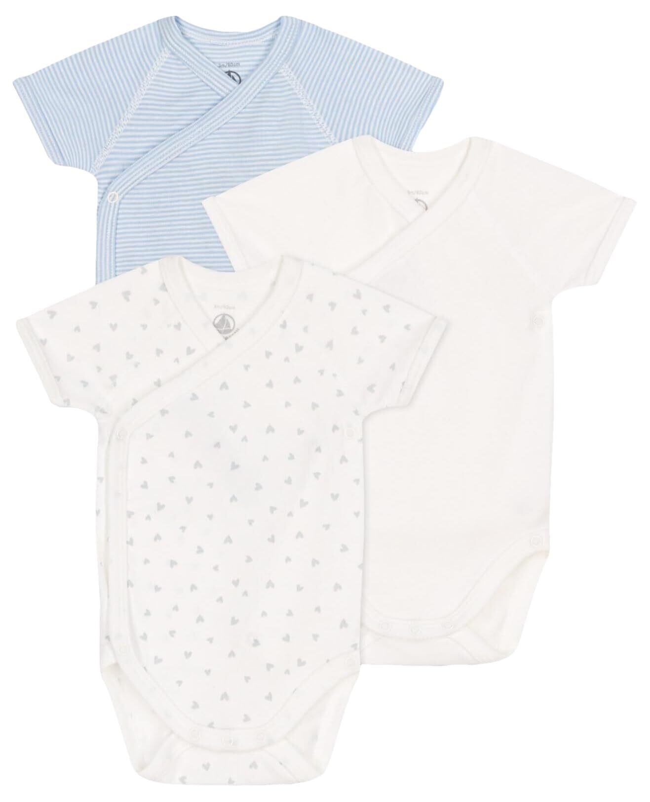 アイコニックなミラレボーダー、人気のハートプリント、清潔感のあるピュアホワイトで揃えた半袖あわせボディ3枚セットです。環境にやさしく、第二の肌と呼ばれるほどやわらかな1x1リブ編みコットン素材を使用し、ナチュラルでやわらかな手触りを実現しています。前面にはスナップボタンが施してあるので、お着替えやオムツ替えも簡単。何枚あっても嬉しいアイテムは、ご自宅での使用はもちろん、ご出産祝いなどのギフトにも大変おすすめです。※濃色の製品は、摩擦や洗濯の際に色落ちや色移りをする場合があります。中性洗剤で単独洗いをしてください。