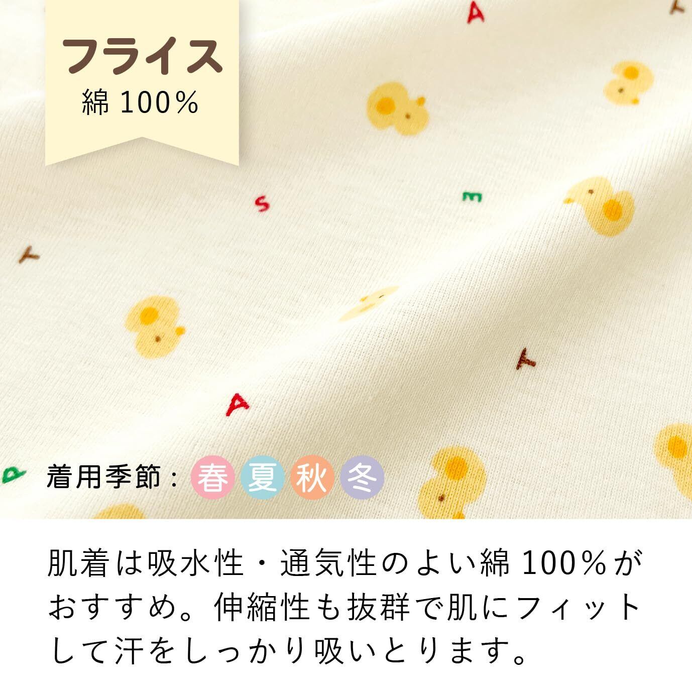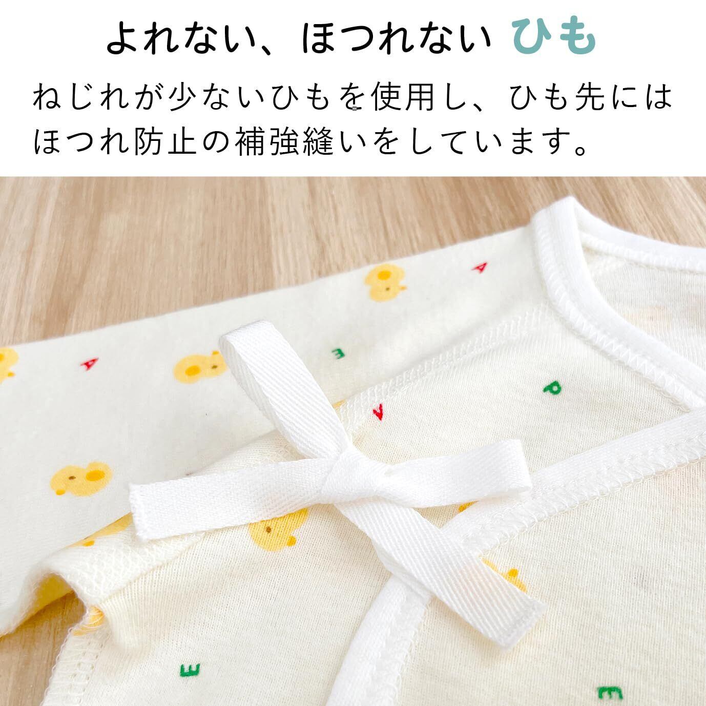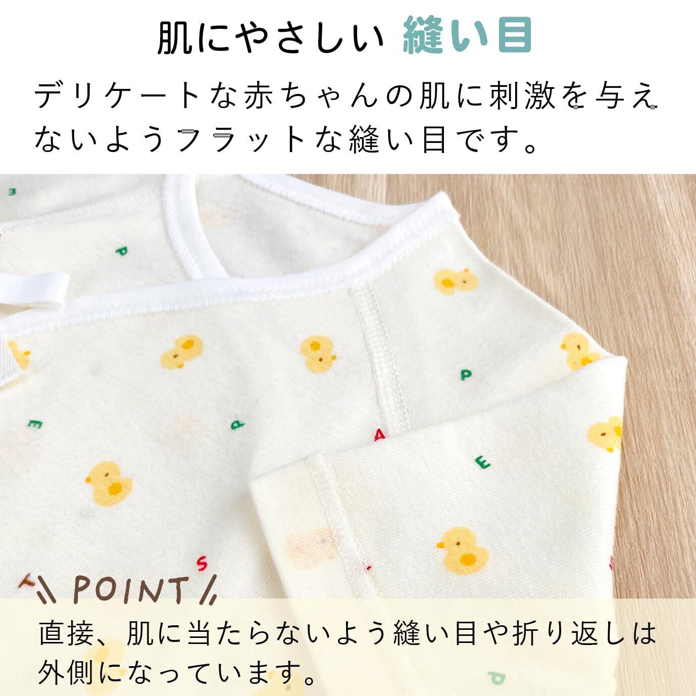 【着心地のよさ】デリケートな赤ちゃんの肌に刺激を与えないように、縫い目は平面縫製を採用。特殊な縫製技術で、縫い目がフラットに仕上がります。縫い目や洗濯表示は直接、赤ちゃんの肌に当たらないよう全て外側になっています。また、布の端処理のパイピング部分は縦地に裁断することで洗濯後も伸びにくく変わらない着心地です。