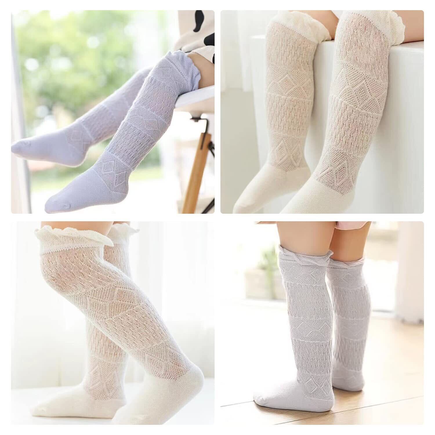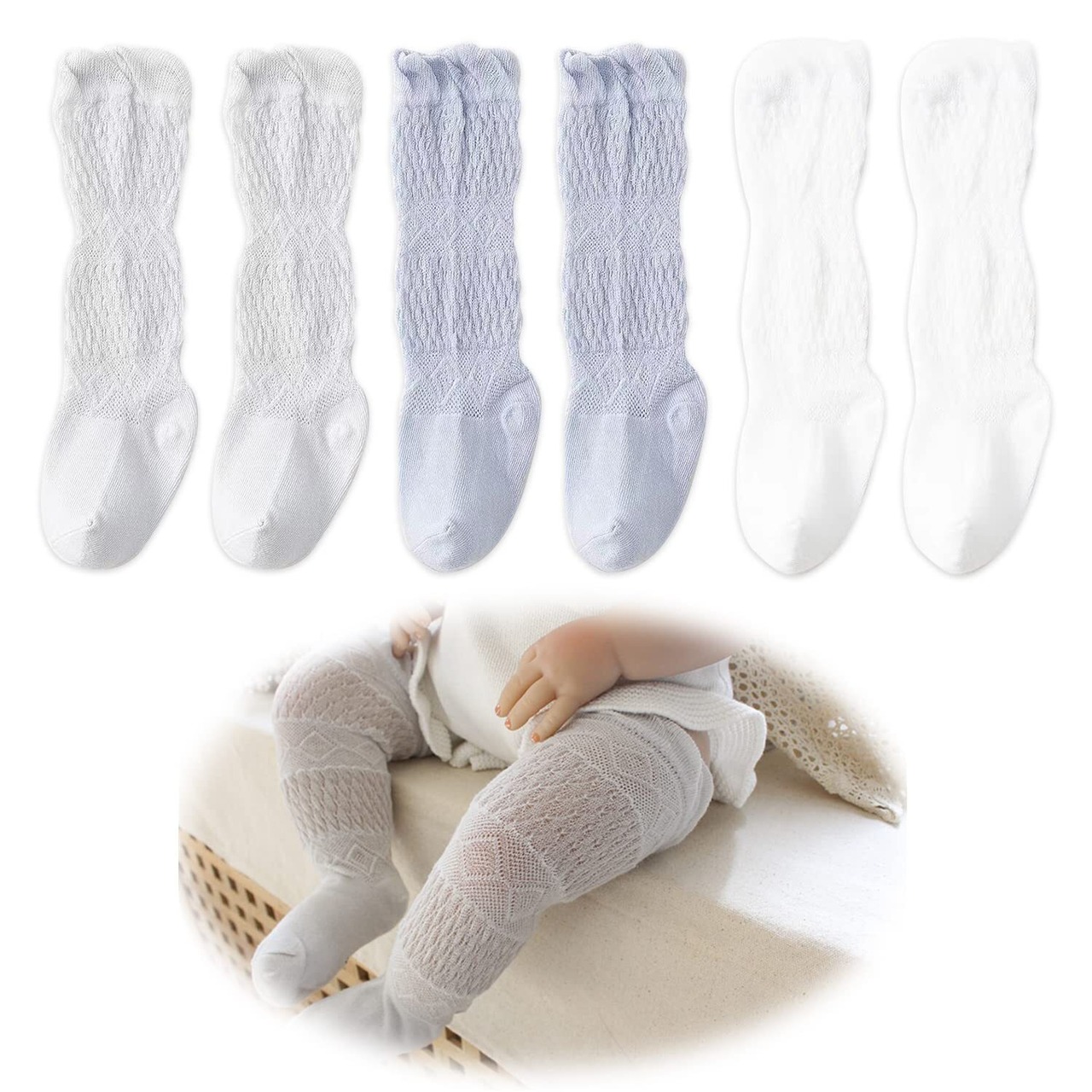 【キュート 赤ちゃん 膝当て】:通気性のあるレースメッシュのデザインと、繊細なダイヤの形がレトロな雰囲気を醸し出しています。トップを折りたたんで短い靴下にするか、膝の上に引っ張ってかわいく見せることができます。彼らはとてもかわいいですし、多くの衣装で着用することができます。