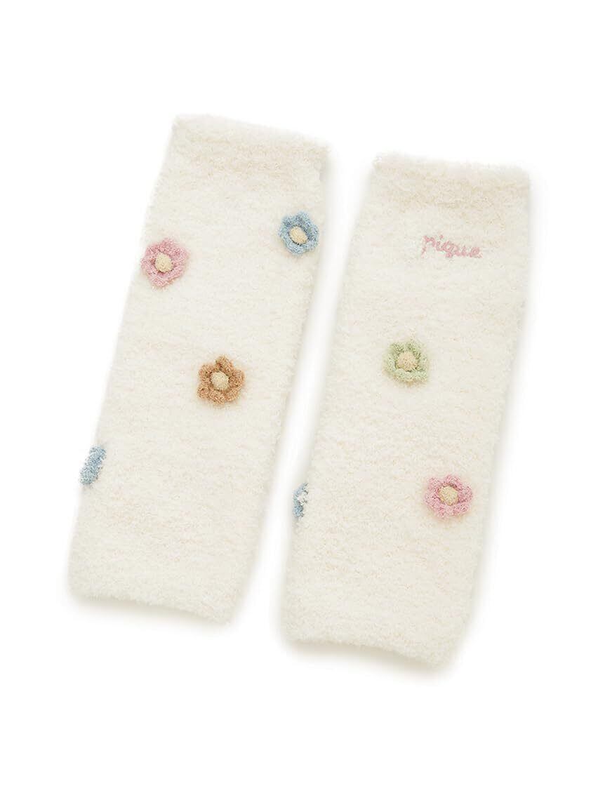 柔らかな肌触りで人気の'ベビモコ'ニットに、立体的でカラフルなお花を散りばめたBABY雑貨シリーズです。お花とスカラップのはき口がキャッチーなレッグウォーマー。ワンポイントでpiqueの刺繍も添えた華やかなデザインです。同シリーズのウェアや雑貨と合わせてギフトにもおすすめです。