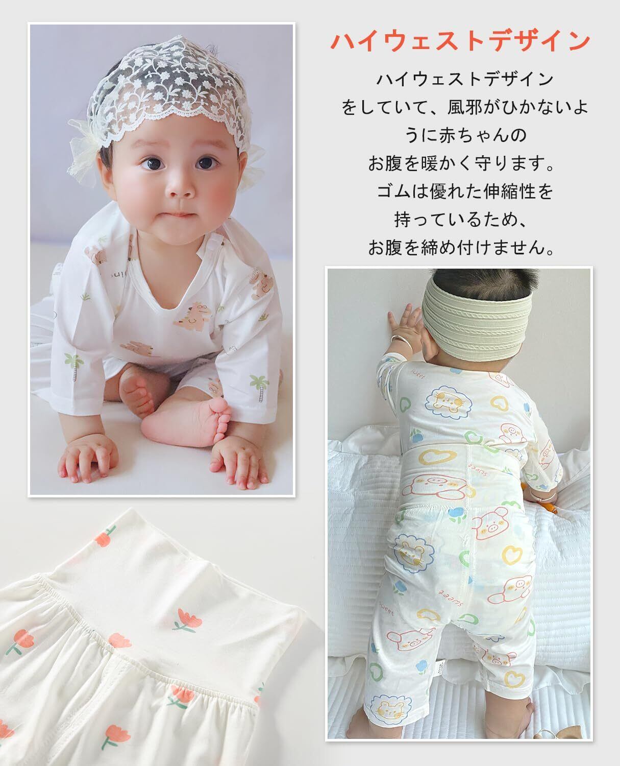 「ハイウェストデザイン」ハイウェストデザインをしていて、風邪がひかないように赤ちゃんのお腹を暖かく守ります。ゴムは優れた伸縮性を持っているため、お腹を締め付けません。