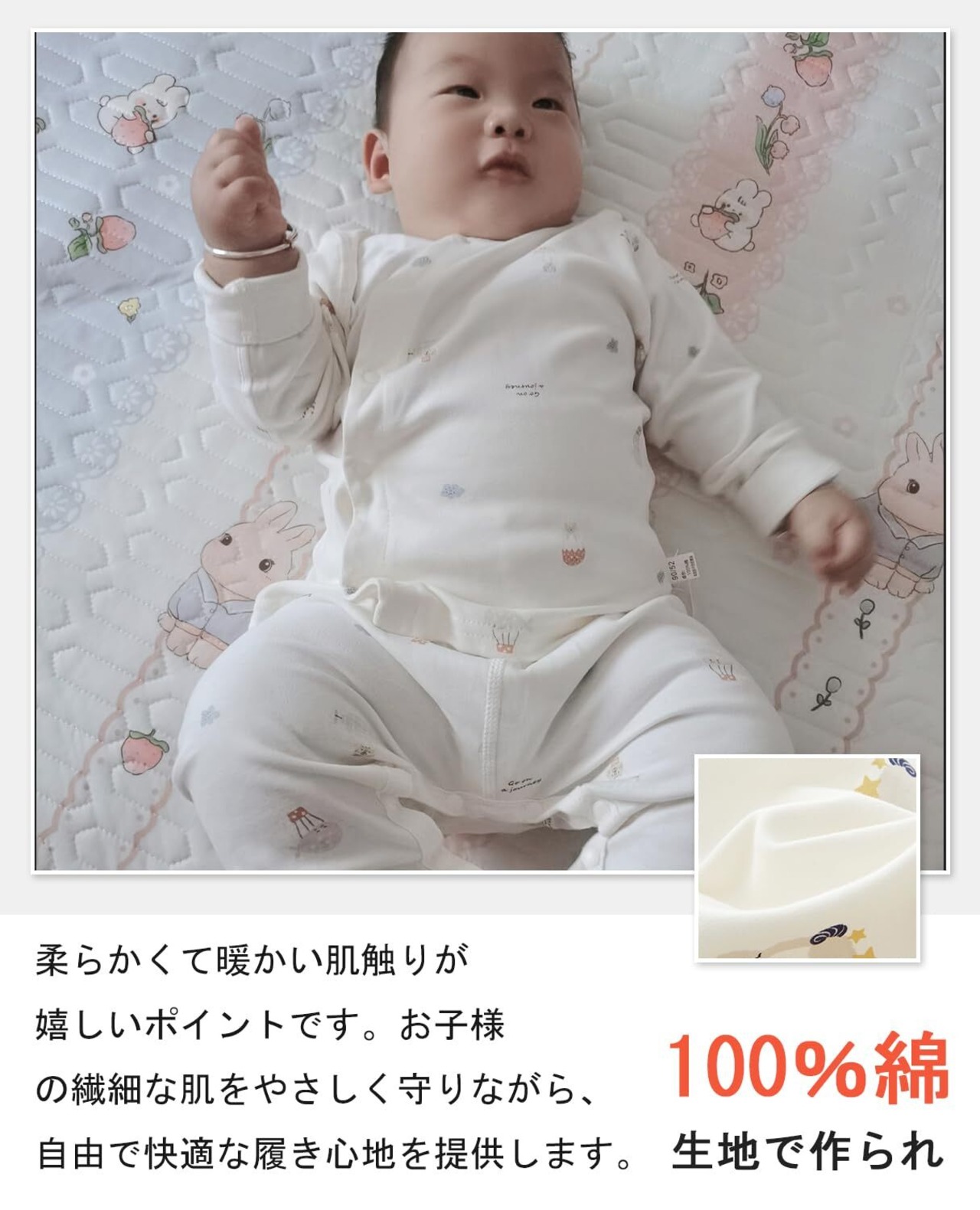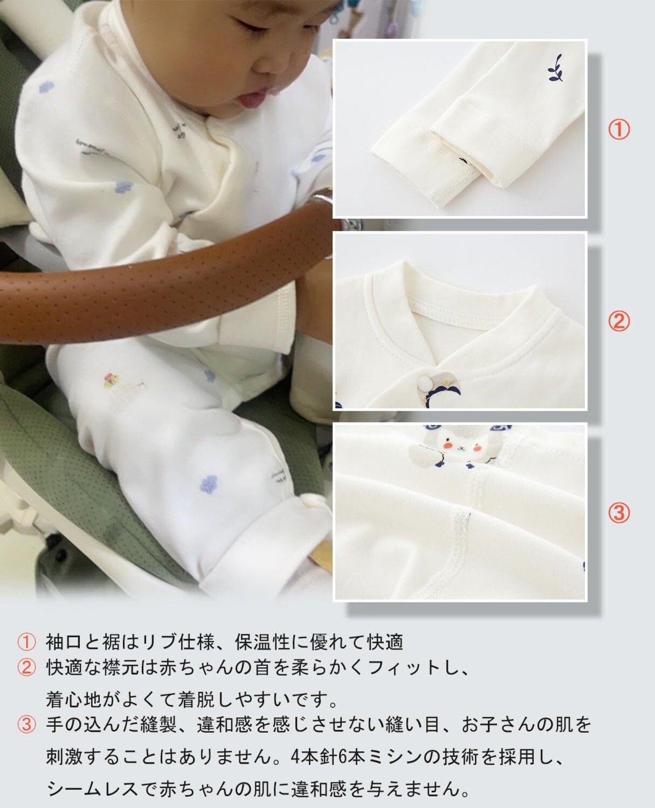 【手の込んだ縫製】環境に優しい印刷と染色、色褪せもしません。手の込んだ縫製、違和感を感じさせない縫い目、お子さんの肌を刺激することはありません。4本針6本ミシンの技術を採用し、シームレスで赤ちゃんの肌に違和感を与えません。