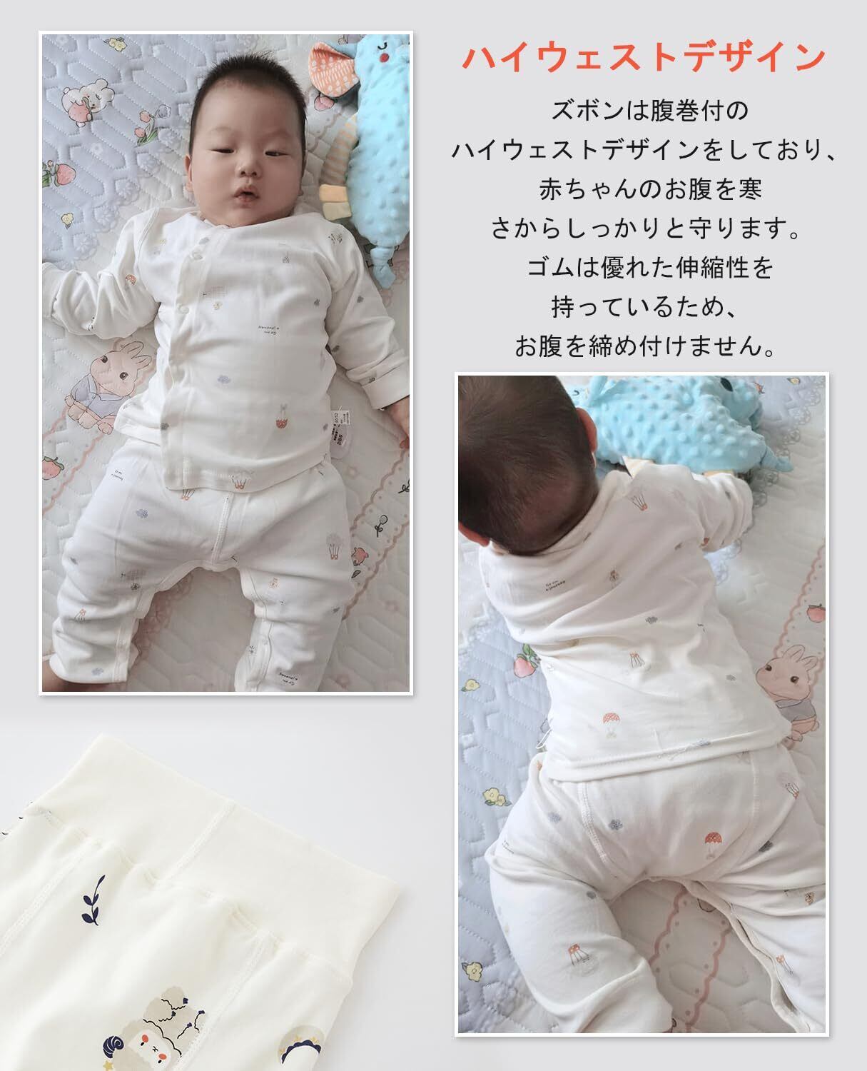 【ハイウェスト腹巻き付】ズボンは腹巻付のハイウェストデザインをしており、赤ちゃんのお腹を寒さからしっかりと守ります。ゴムは優れた伸縮性を持っているため、お腹を締め付けません。