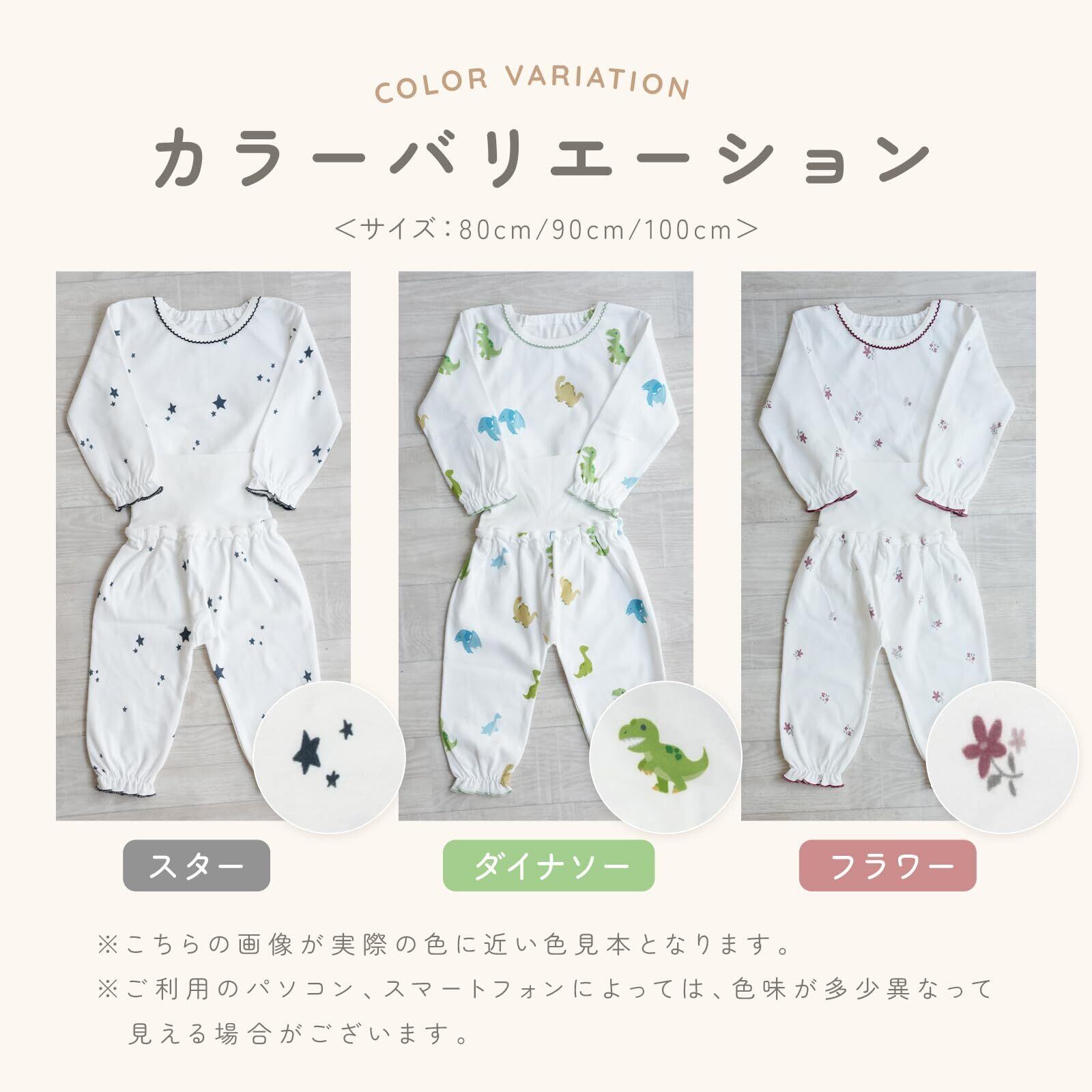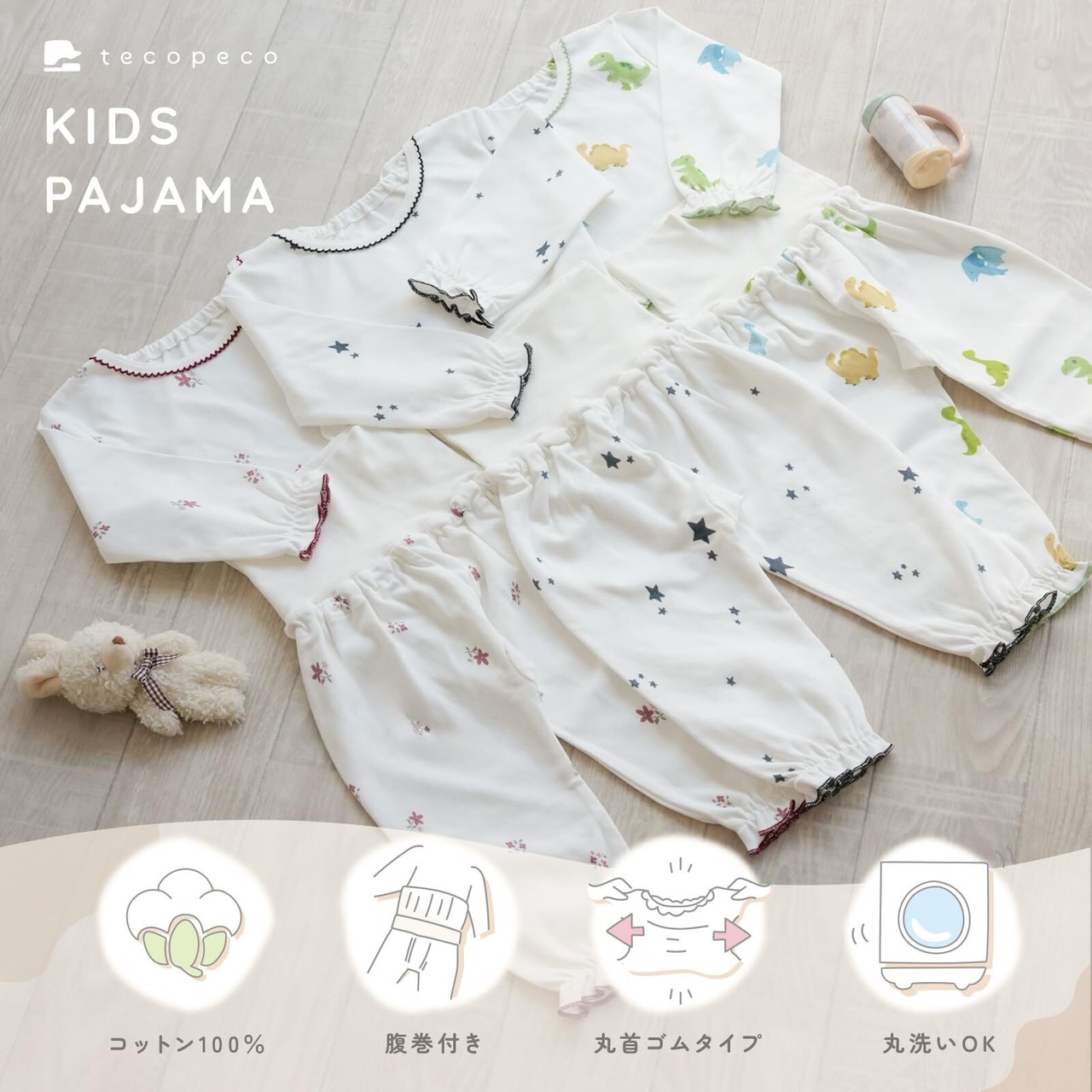 【かわいいデザイン】tecopecoのベビー腹巻パジャマは「ダイナソー」「フラワー」「スター」と女の子も男の子 もかわいく着用していただけるおしゃれなデザインが揃っています 大人も子供も気分の上がるおしゃれなデザインでお着替えも楽しくなる