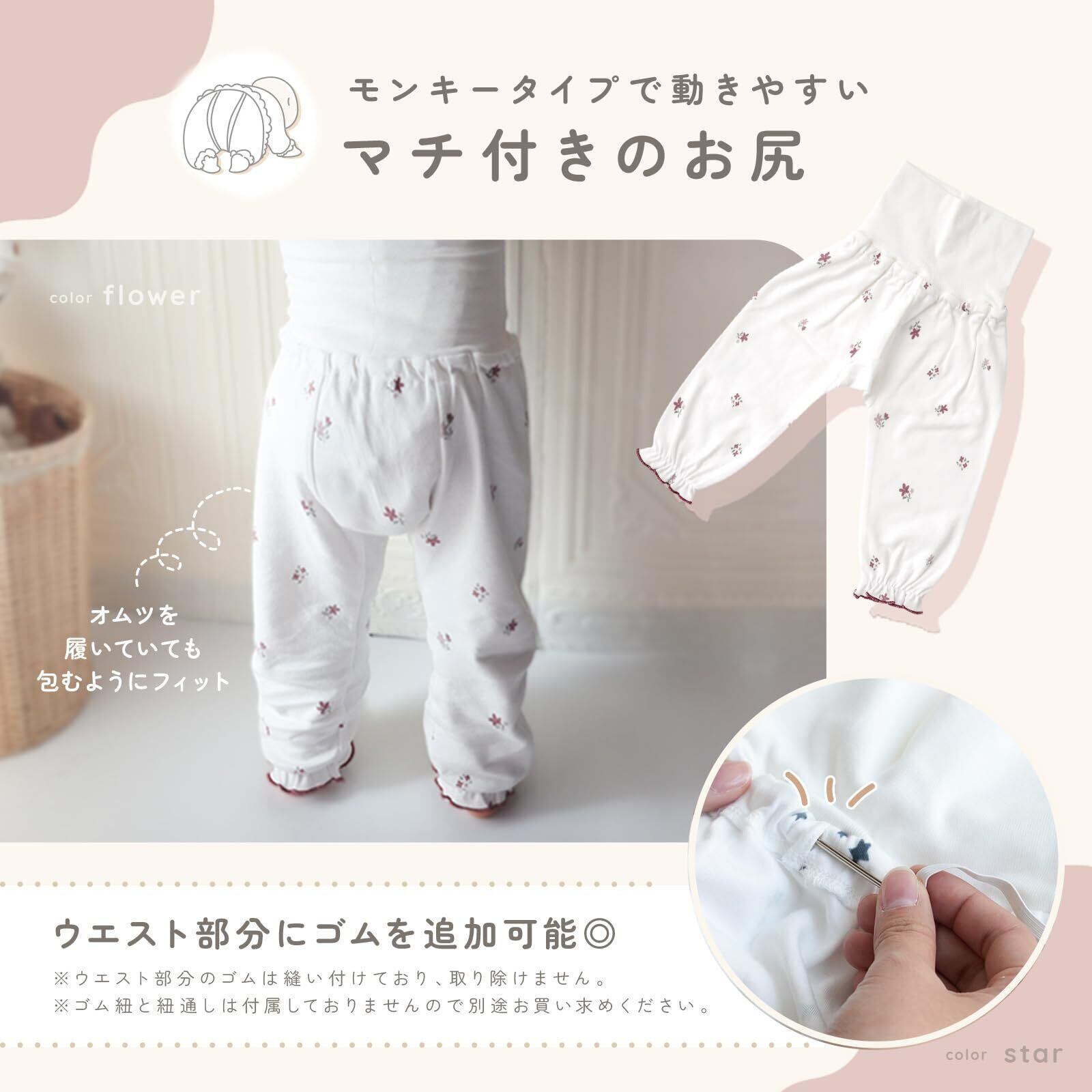 【伸縮性のある腹巻部分】腹巻パジャマは伸縮性のある腹巻部分がポイント! 伸縮性があることによって赤ちゃんのお腹をしっかり覆いどの姿勢でもお腹が出にくいので冷えを予防 また赤ちゃんが寝返りをうっても睡眠の妨げにはなりません◎
