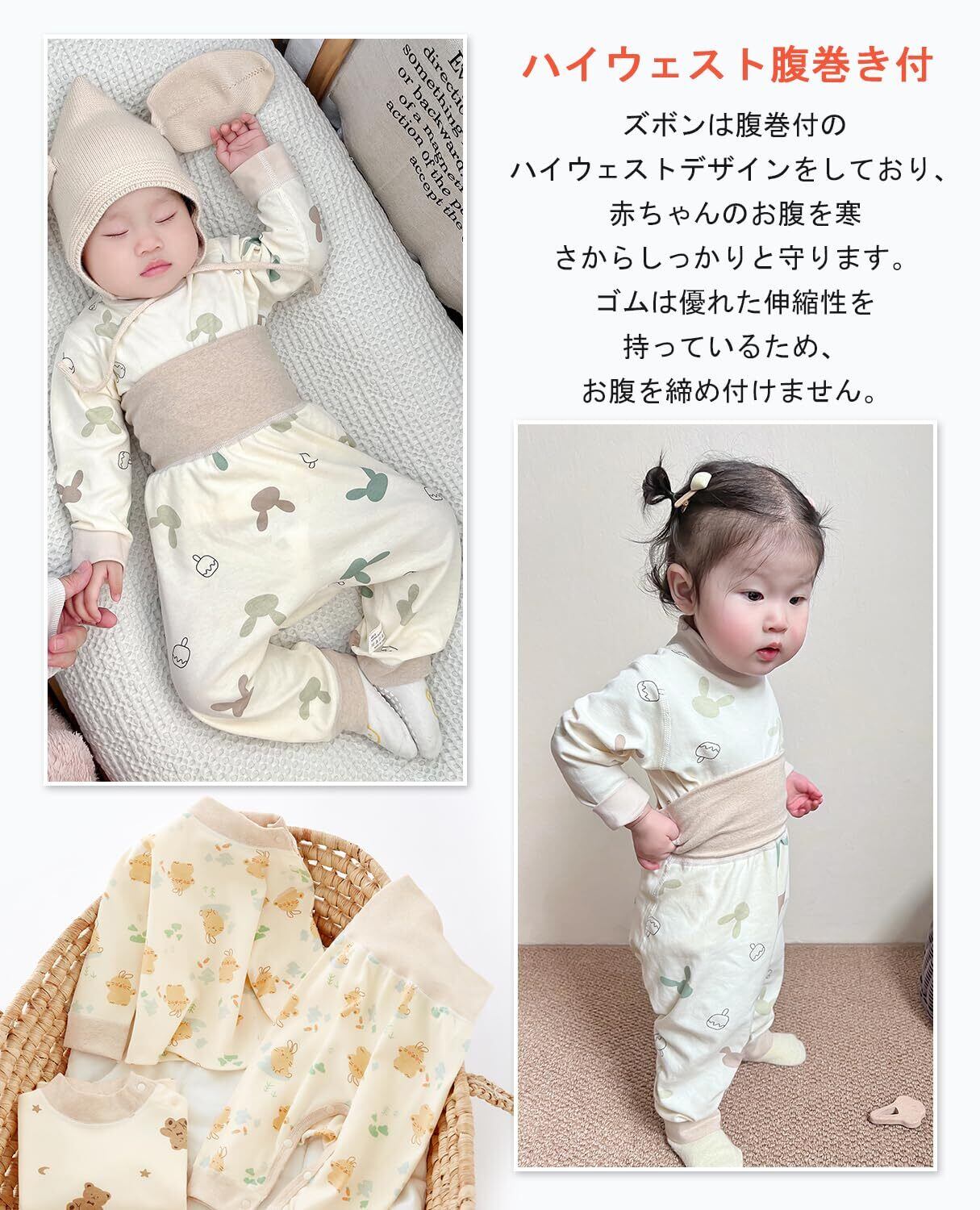 【ハイウェスト腹巻き付】ズボンは腹巻付のハイウェストデザインをしており、赤ちゃんのお腹を寒さからしっかりと守ります。ゴムは優れた伸縮性を持っているため、お腹を締め付けません。パンツの裾はリブ付きています。