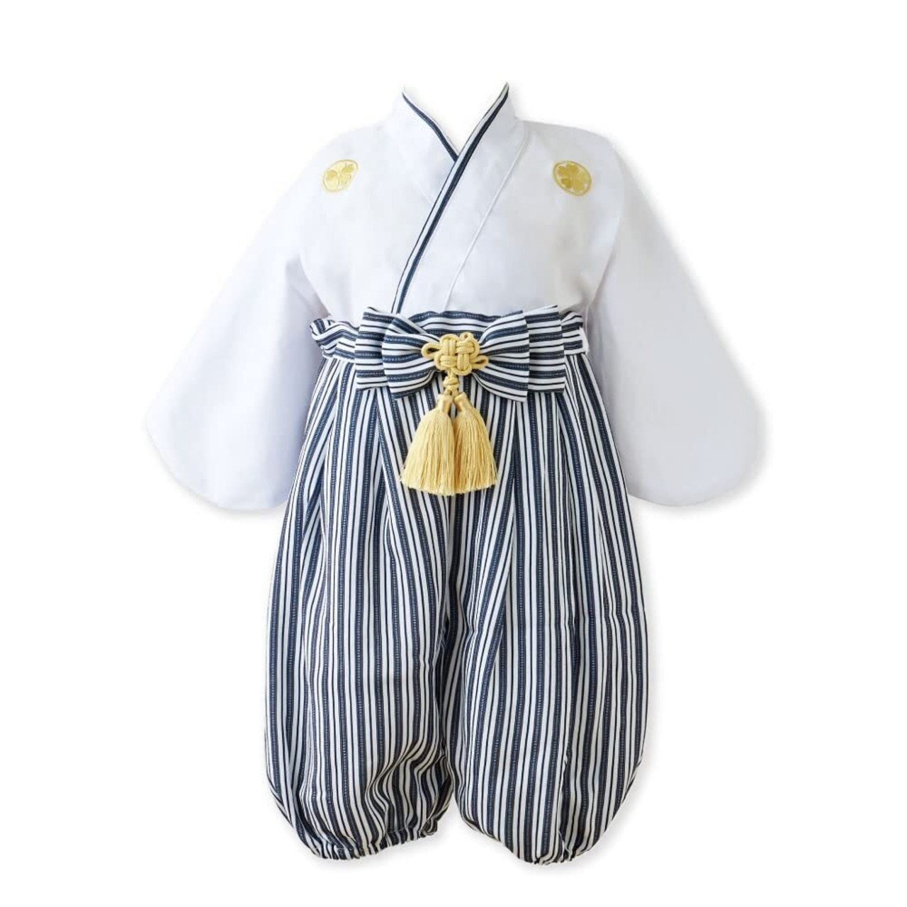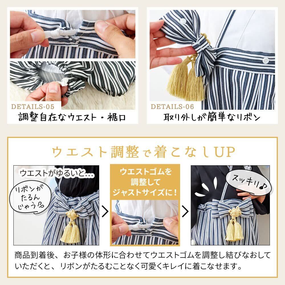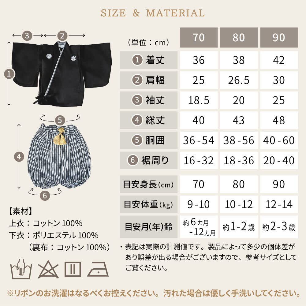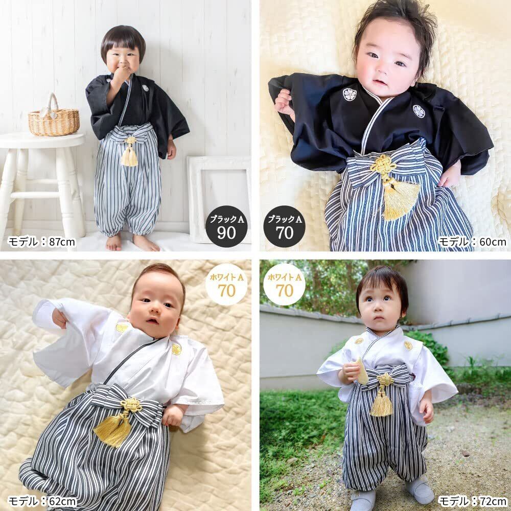 ✨モノトーンのシンプルな配色に、タッセルのシャンパンゴールドがアクセントになったオシャレな紋付袴は、お正月や初節句、結婚式などお祝いの席にぴったり。上衣はコットン100%、ポリエステルちりめん製の下衣にもコットン100%の裏布が付いているので着心地もよく、ウエスト・裾口の調整もでき機能性も抜群です。