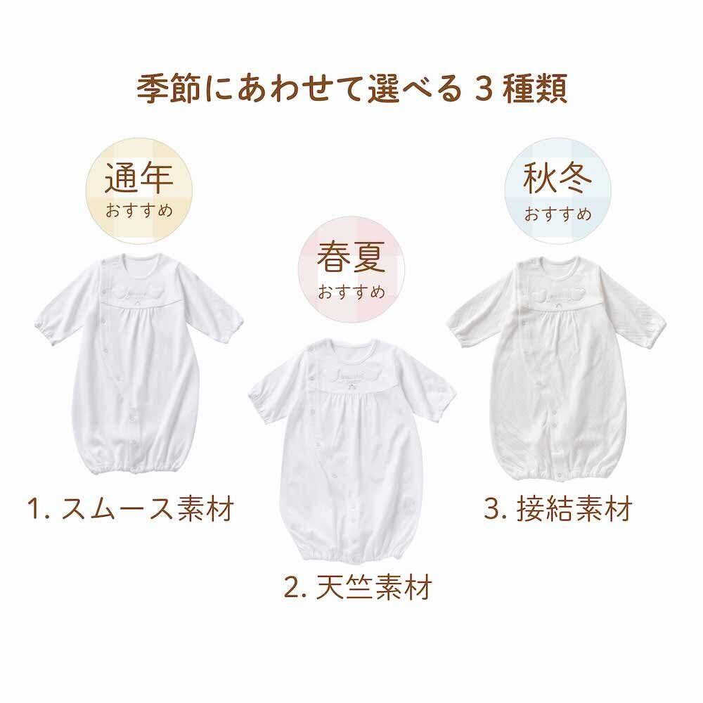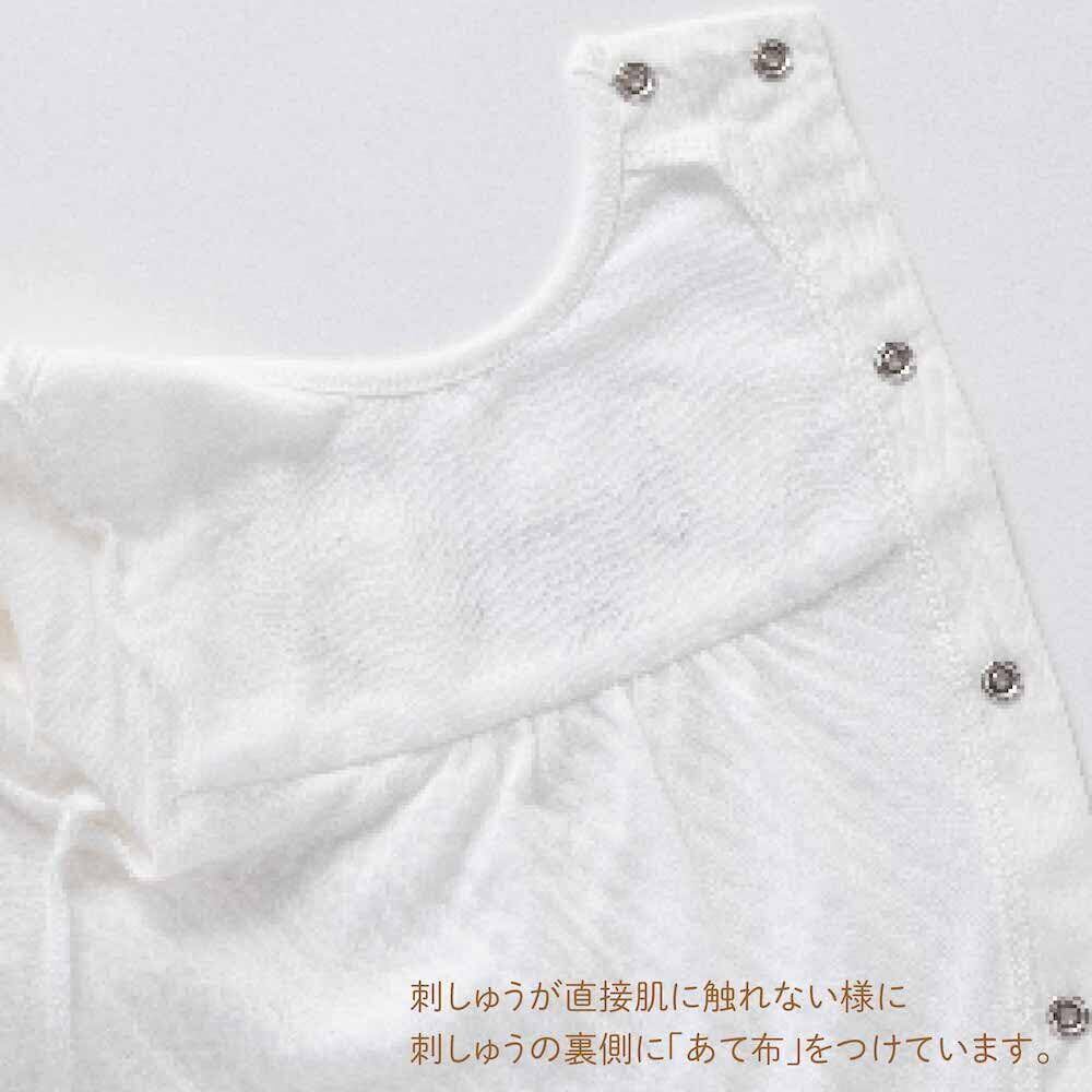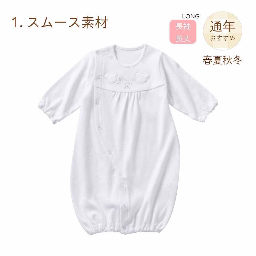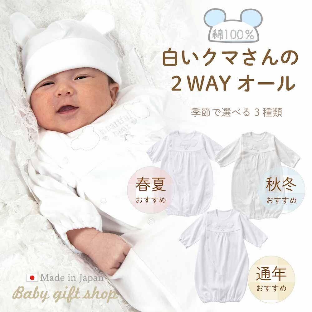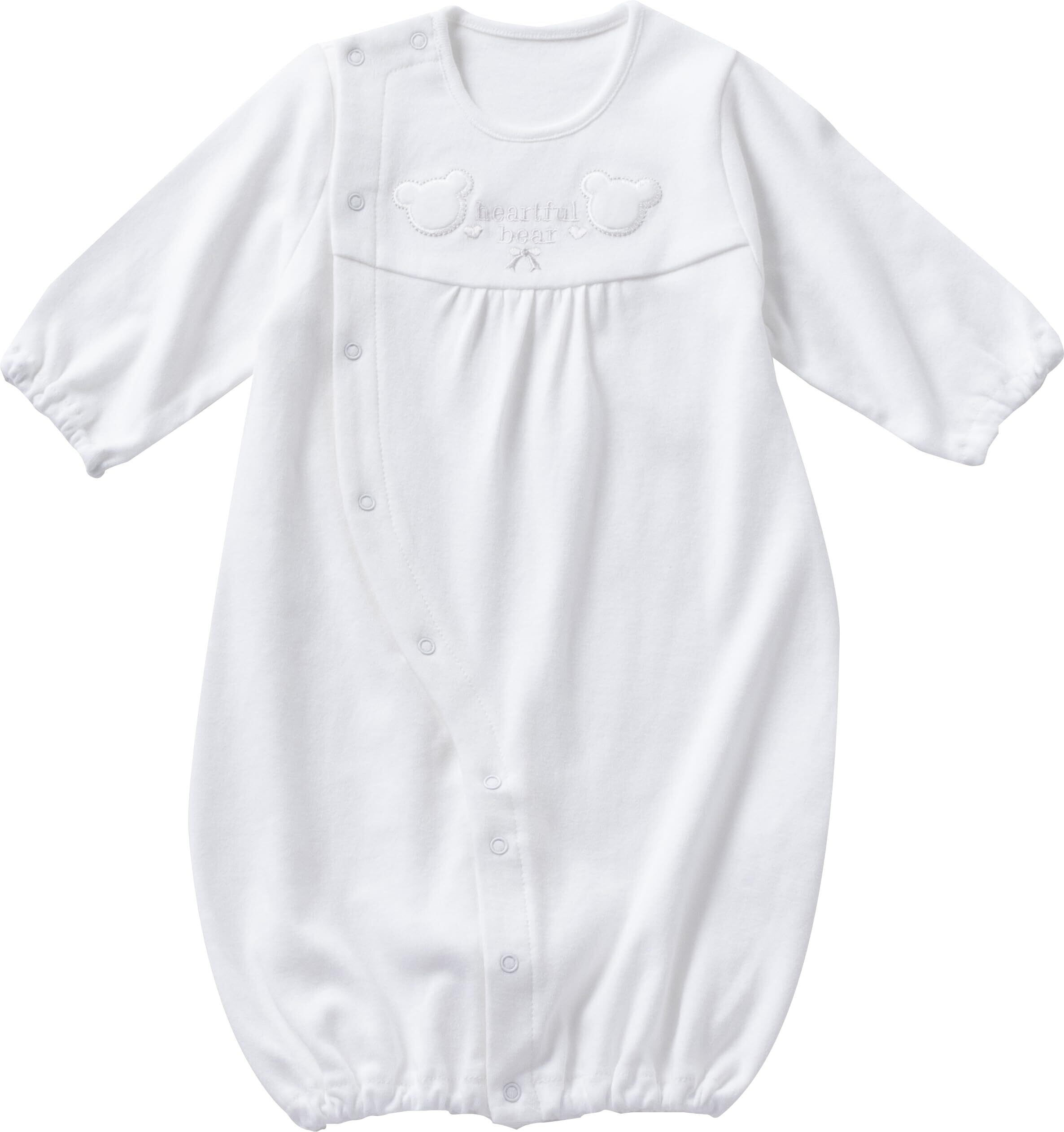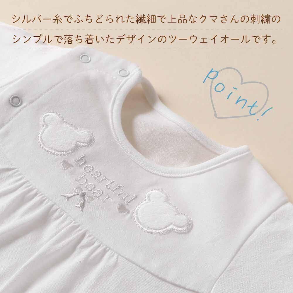 白いクマさんのツーウェイオール 日本製 50~70cm シルバー糸でふちどられた繊細で上品なクマさんの刺繍のシンプルで落ち着いたデザインのツーウェイオールです。 男の子、女の子どちらにもおすすめです。 【成長に合わせて長く着られる】 新生児~6ヶ月頃まで長く使えます。(※着用期間は大体の目安です) ご自宅用にはもちろん、誕生日プレゼント、出産祝いや退院祝いなどのお祝い品としても最適です。 【股スナップの付け替えで2WAYに】 新生児期には後身頃のスナップを全て留めて筒型ドレスで、動きが活発になってくる乳児期には左右のスナップを留め分けてカバーオールとしてお使いいただけます。 【安心の日本製】 生地から仕上げまで安心・安全の日本製。ベビー衣料専門メーカーとして創業 昭和34年以来、赤ちゃんが着るものだから安心・安全・高品質を保つため自社一貫生産にこだわり、生地の裁断から仕上げまで大阪の自社工場で1枚・1枚丁寧に縫い上げています。