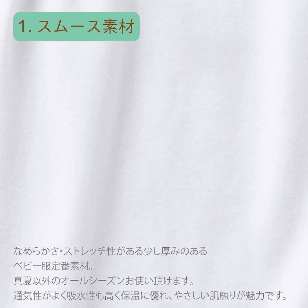 【股スナップの付け替えで2WAYに】 新生児期には後身頃のスナップを全て留めて筒型ドレスで、動きが活発になってくる乳児期には左右のスナップを留め分けてカバーオールとしてお使いいただけます。