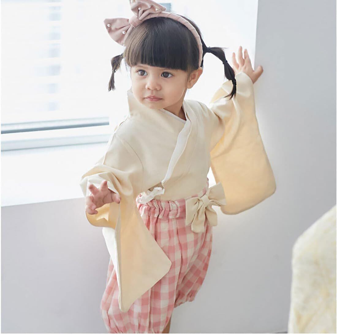 ■単衣(トップス):亜麻55%、綿45%■袴(パンツ):綿65%、ポリエステル35%。おしゃれでかわいい袴風セットアップ。上下が分かれているので脱ぎ着しやすく、お子様を寝かせる必要もなくお洋服と同じように着替えができます。