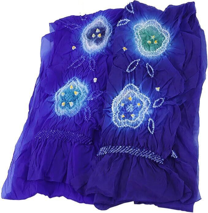 伝統的デザイン: 美しい青色の絞り染めと花柄模様が特徴的な子供用兵児帯です