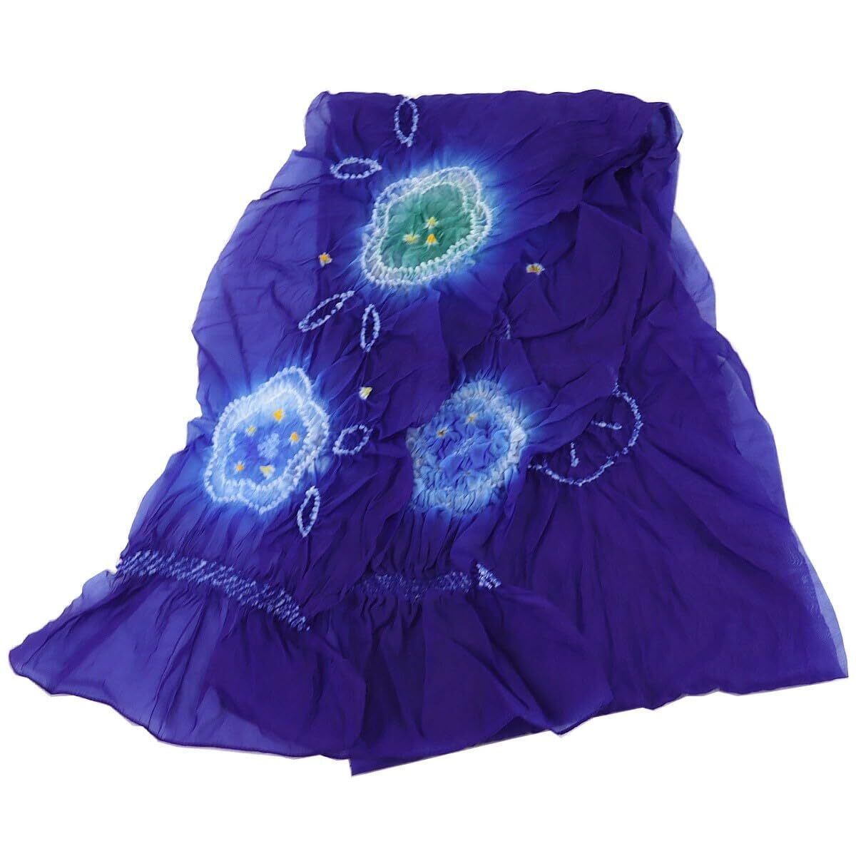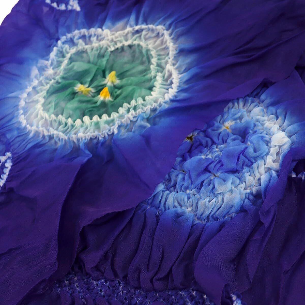 素材と加工: 鮮やかな紫色の生地に、水色の花模様が施された伝統的な絞り染め技法を使用