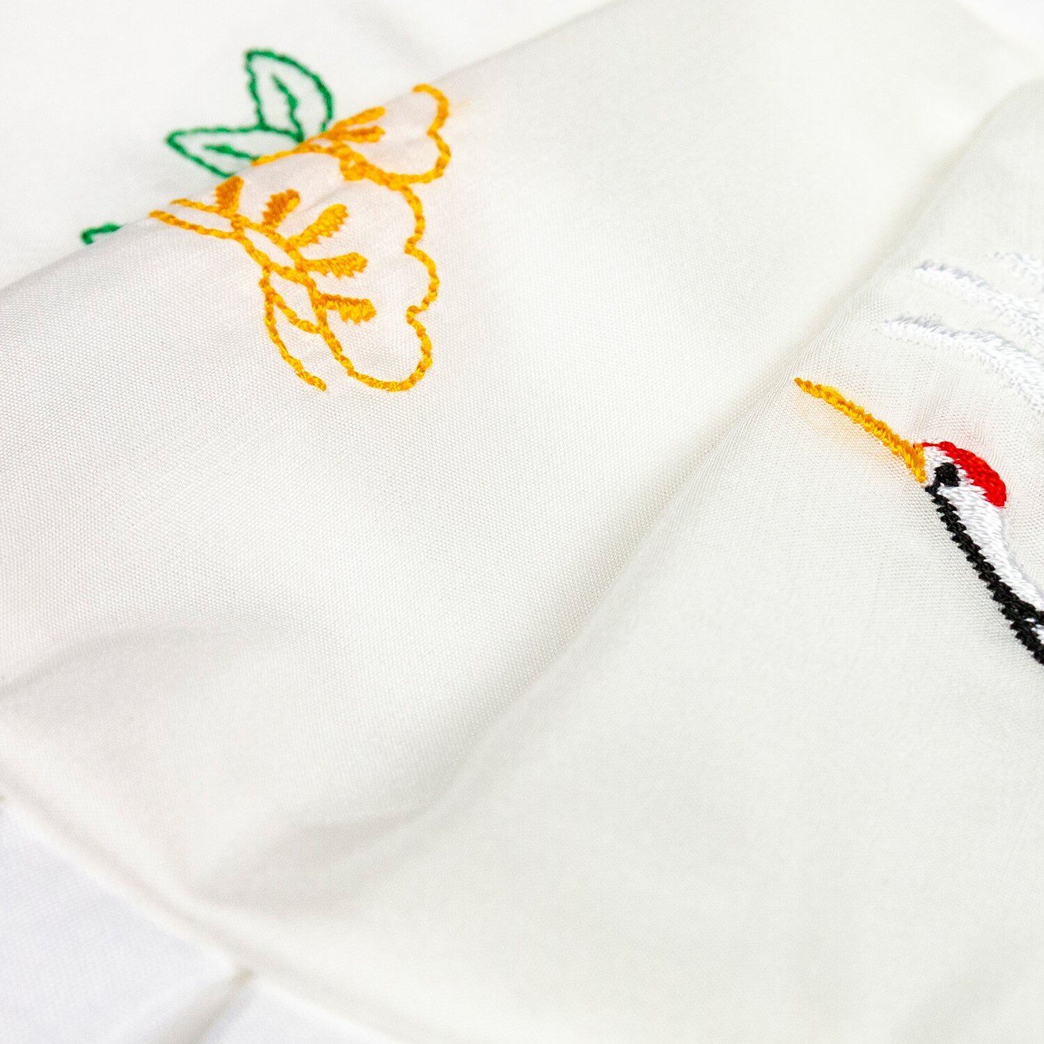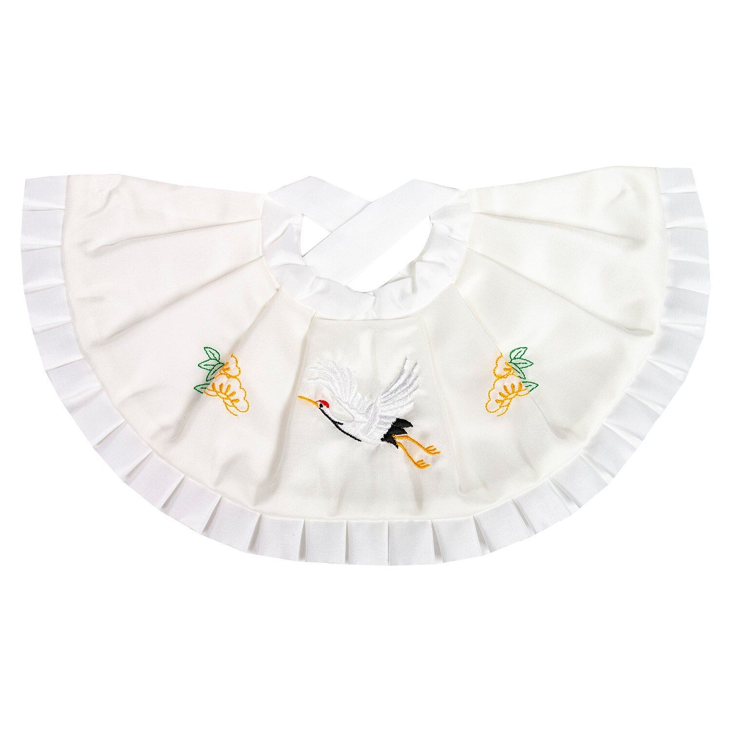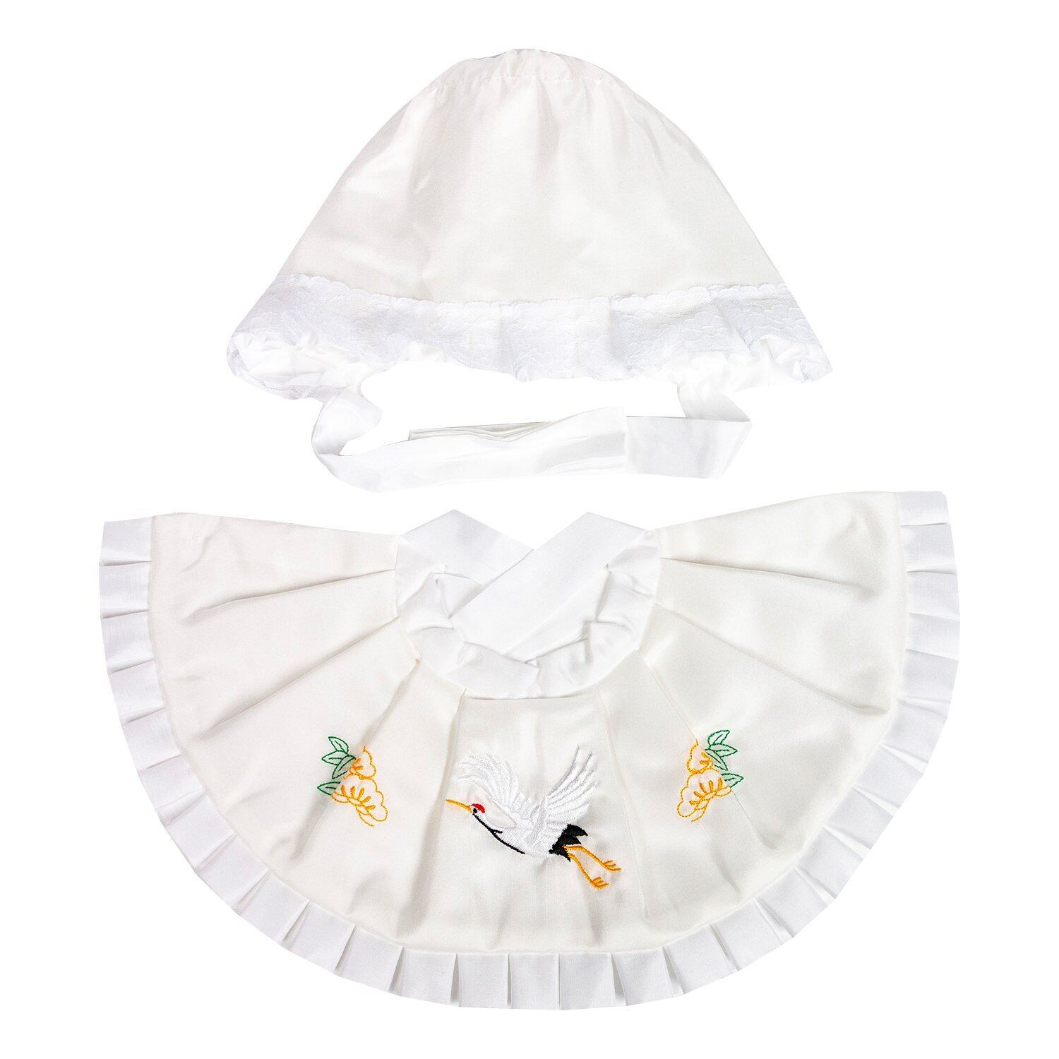 [色と柄]:帽子:白×レース、よだれかけ:白×レース×鶴と松の刺繍/帽子:白×レース、よだれかけ:ピンク×レース×鶴と松の刺繍